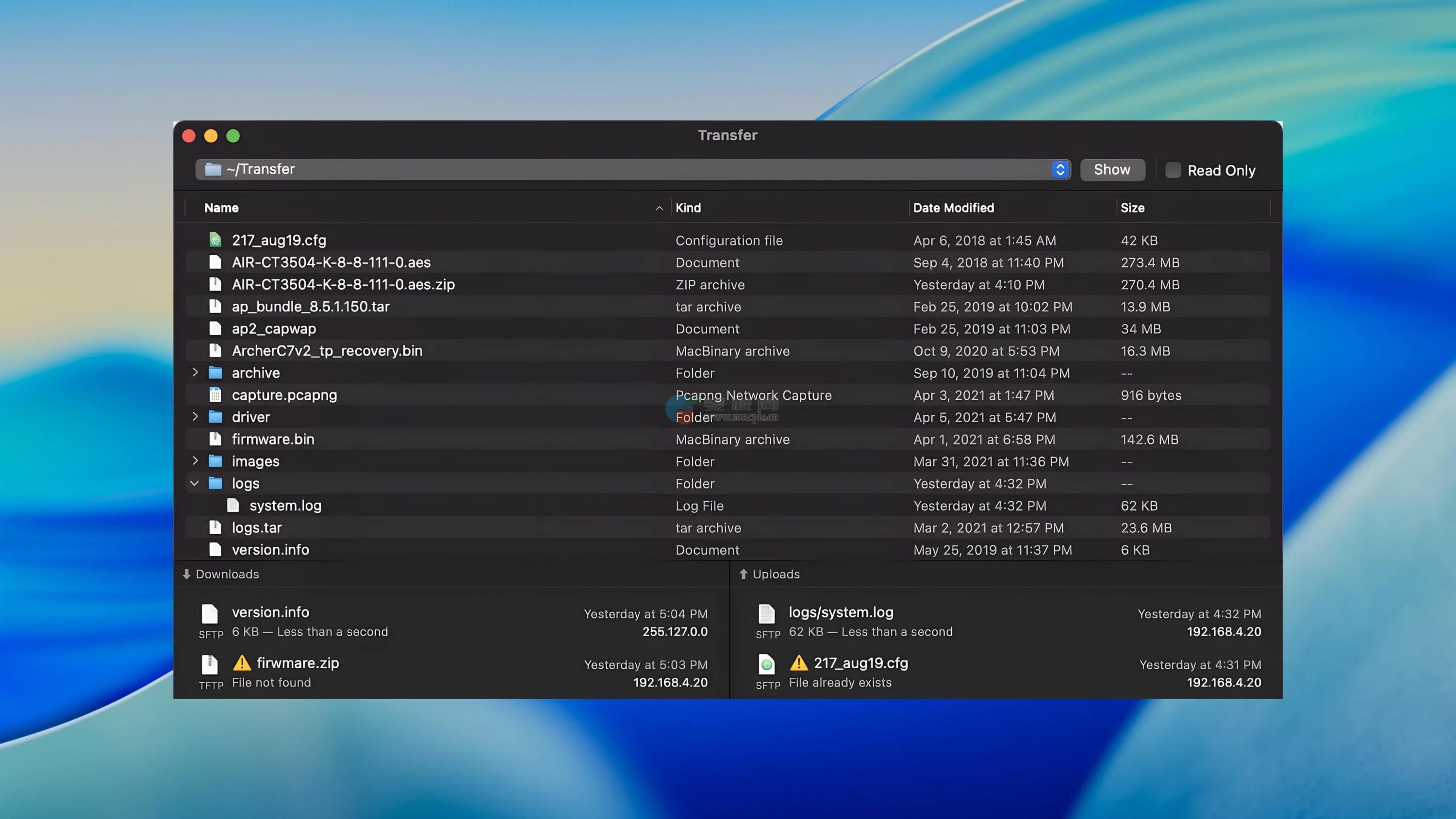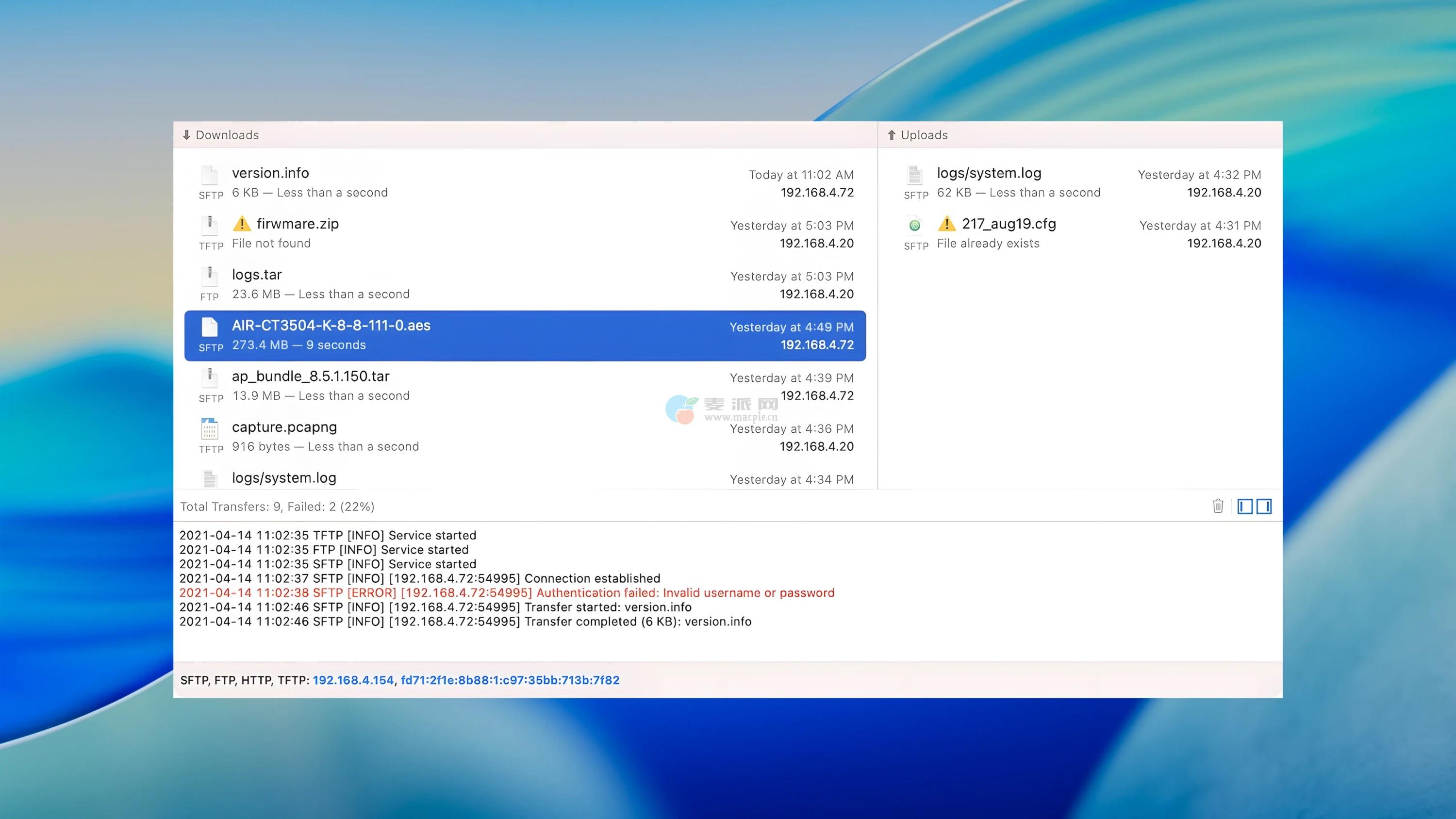 Transfer是一个独立的多协议(TFTP、FTP、SFTP)文件传输服务器,具有现代而直接的用户界面。Transfer专为网络管理员和IT专业人员设计,以帮助管理使用TFTP、FTP或SFTP执行固件更新、拉取或推送配置文件、检索日志等的网络设备和其他设备。传输是Mac内置或第三方TFTP、FTP和SFTP服务器的完美替代方案,因为它很方便,不需要任何额外的设置,并且允许您查看每次文件传输的实时信息。它还将文件共享限制在Mac中的特定文件夹中,防止访问其他用户和系统文件。