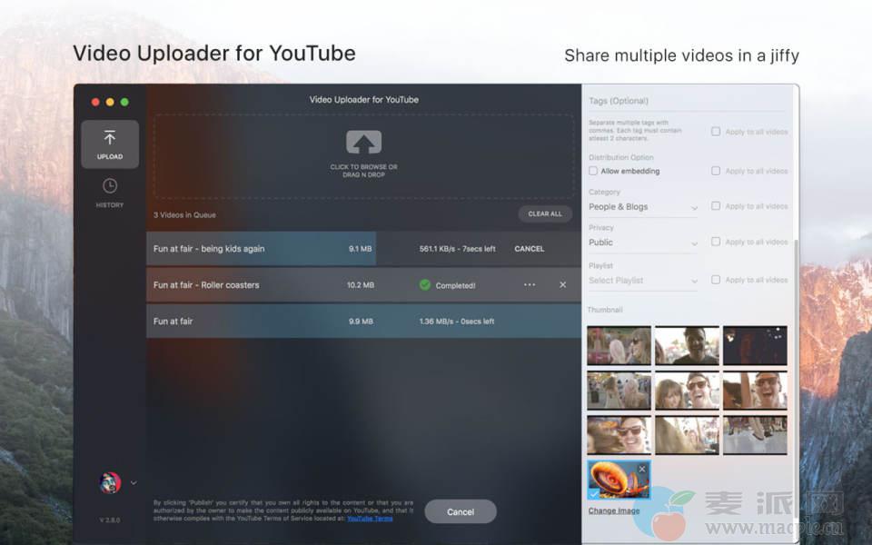 Video Uploader for YouTube是适用于Mac的YouTube视频上传器。可让您将视频从Mac无缝上传到YouTube,并在一个地方进行全部管理。