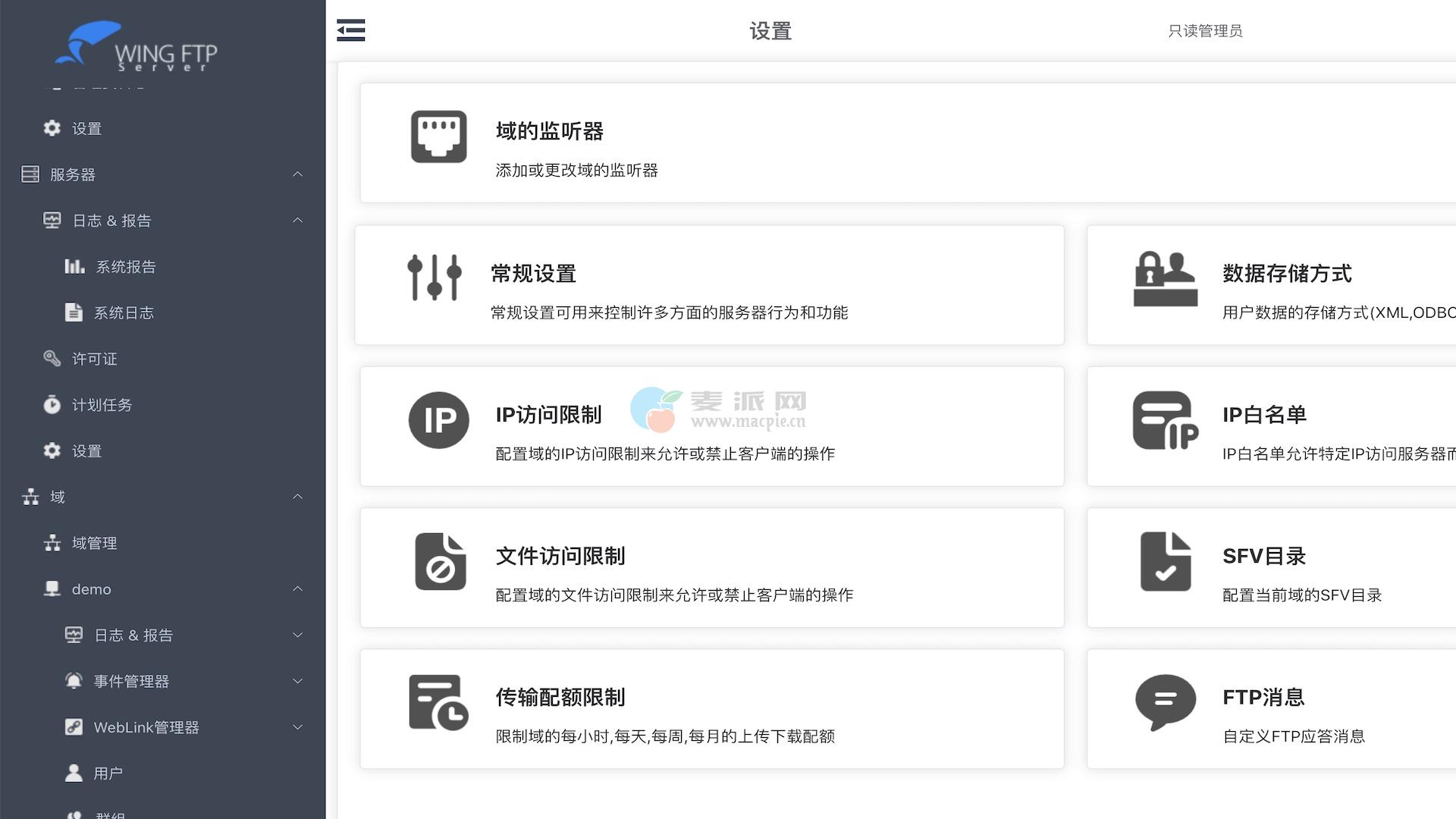 Wing FTP Server是一款功能强大、易于使用且安全的FTP服务器解决方案,可用于Windows、Linux、Mac OSX和Solaris。它支持多种文件传输协议,包括FTP、HTTP、FTPS、HTTPS和SFTP,让您的最终用户能够灵活地连接到服务器。它为管理员提供了一个基于web的界面,让他们可以从任何地方管理服务器。您还可以监控服务器性能和在线会话,甚至接收关于服务器上发生的各种事件的电子邮件通知。