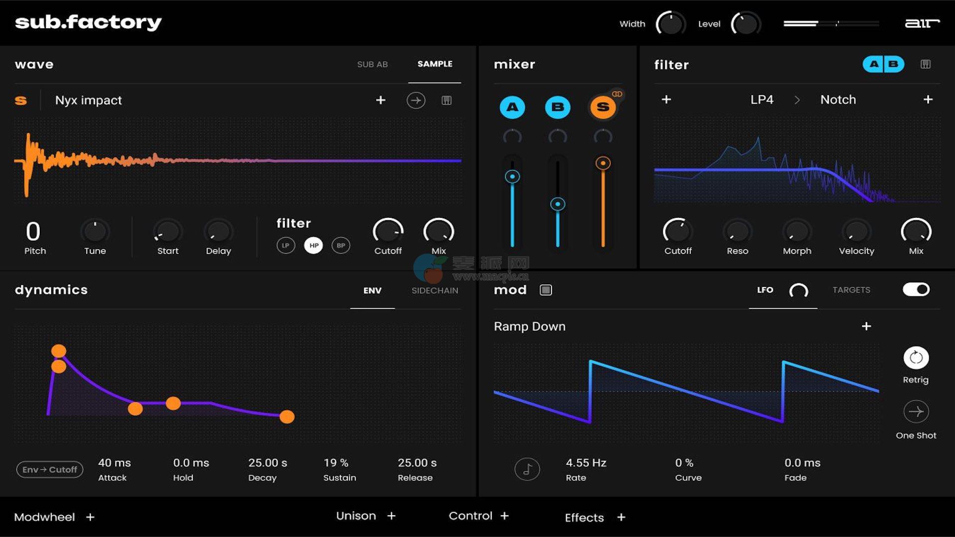 深入其复杂的滤波器,使用专用的音高控制进行微调,并使用全面的放大器和滤波器包络塑造您的声音。直观的mod部分,加上各种目标选项,让您能够制作真正属于自己的声音。
