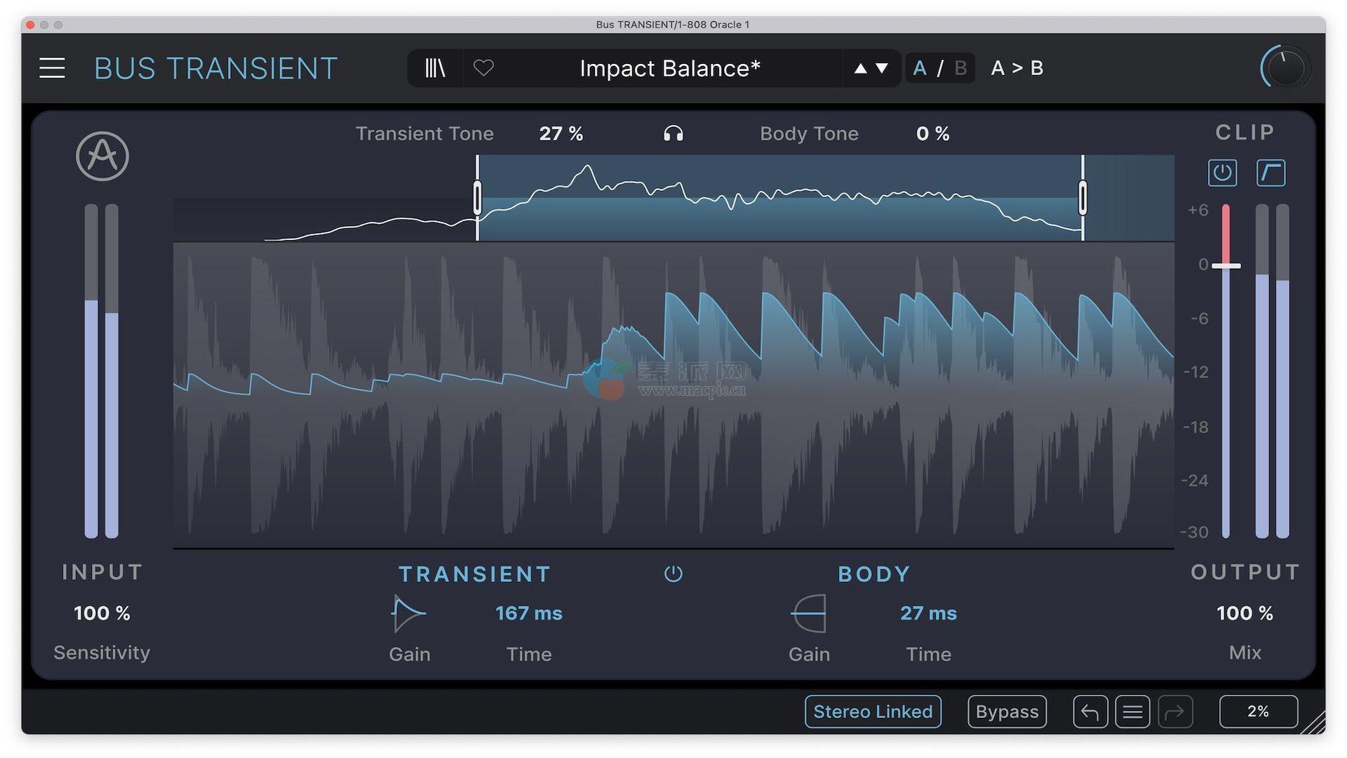 Bus TRANSIENT是一个专业的瞬变整形器,旨在让您即时控制声音的起音和延音。从更紧的鼓到更有力的混音,它通过直观的界面和清晰的视觉反馈提供快速的音乐效果。微调攻击和身体控制给你精确,即时的打击和重量,多波段精度。加重小军鼓,收紧低音喇叭,或者给一个听起来很细的乐器增加一些音色。内置的软/硬限幅器管理峰值并增加特性。保持你的声音洪亮,而不引入不必要的刺耳声音——增加驾驶时的温暖和饱和度。