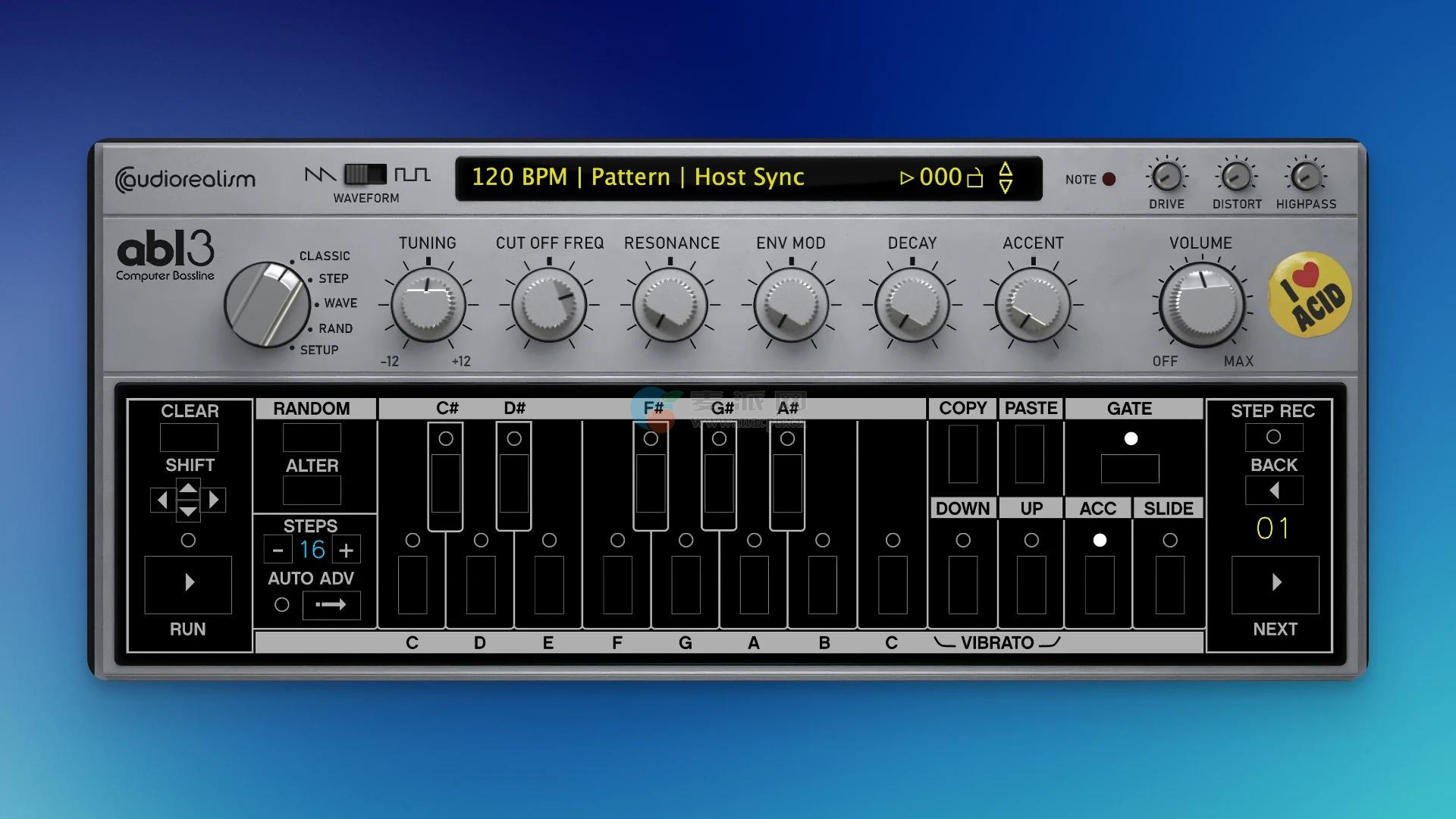 ABL3x是一个工具,用于创建脉动低音线,准确地再现了传奇的1982年低音机器的声音,以其“酸”的特性而闻名。