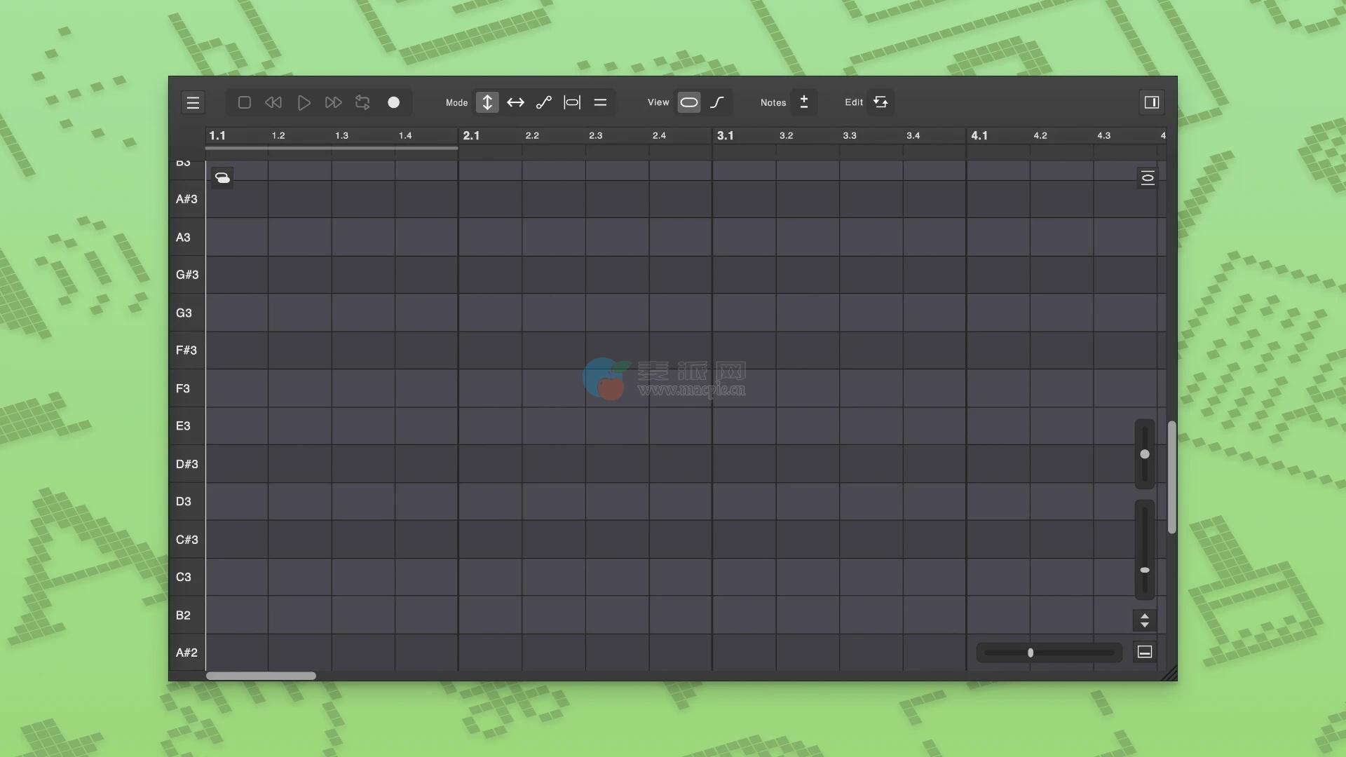 音符的高度以颜色段的形式显示,其中的颜色清晰地显示出精确的宇宙。这是你正确识别问题和了解开始改正的地方。主要工具可以改变每个音符的高度、倾斜度、颤音、辨音和振幅,帮助直观地了解现代和控制的世界。