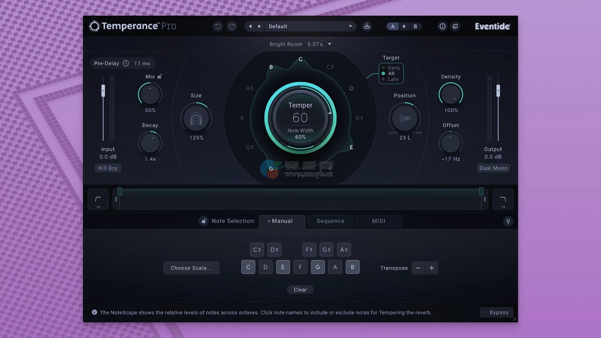 借助“Temper”和“Range”调节器,用户可以调整混响的音乐性、增强或衰减的清晰度或所选计数,以及选择发生在哪一个八度音阶。此外,“Target”和“Note Width”这两个参数进一步扩展了功能,使您在录音室工作和现场表演中能更好地控制音效表现。