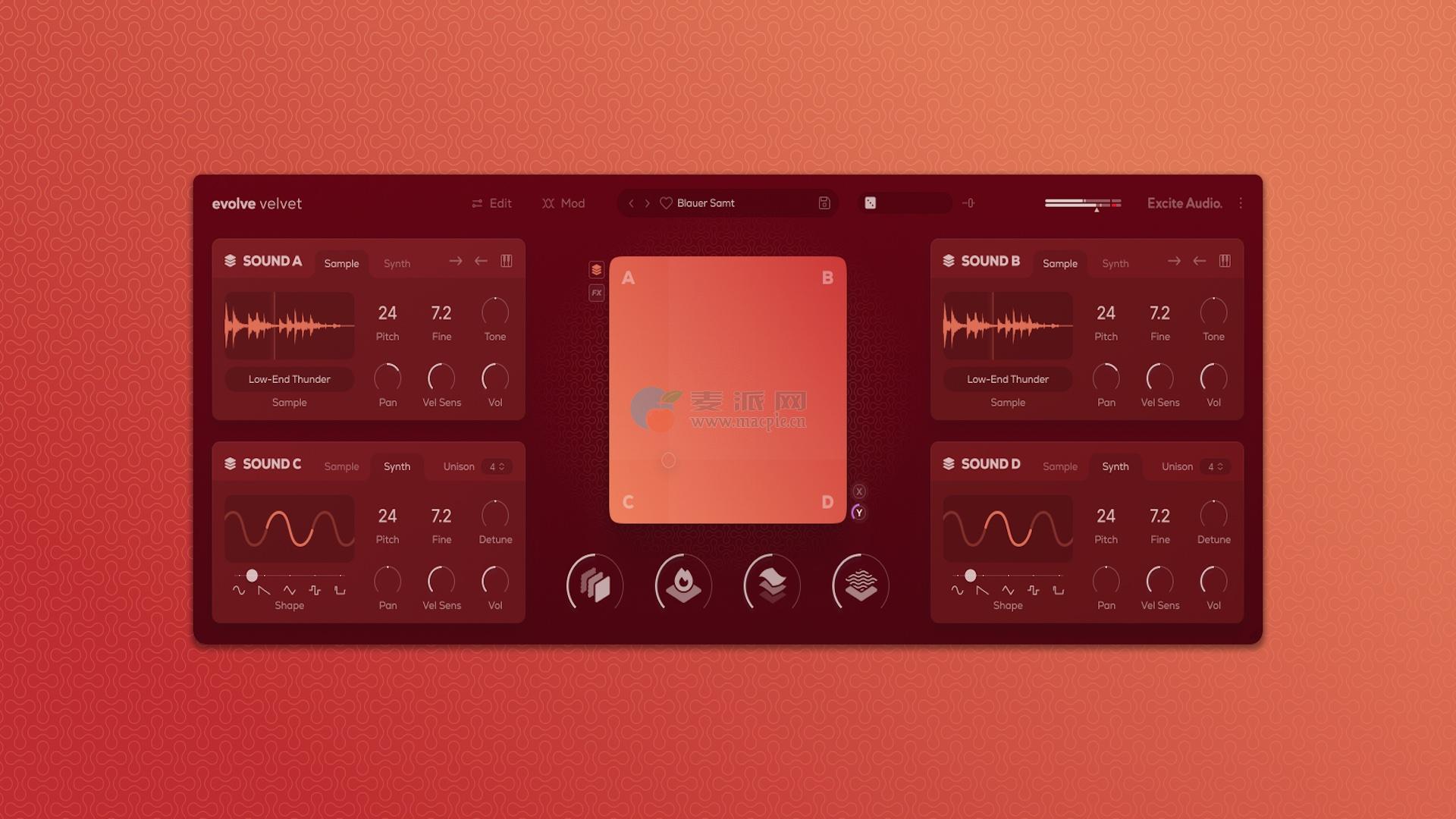 四层混合引擎,支持样本和振荡器,XY变形,天鹅绒风格的4个宏效果,导入自己的样本,声音随机化和250个预设。