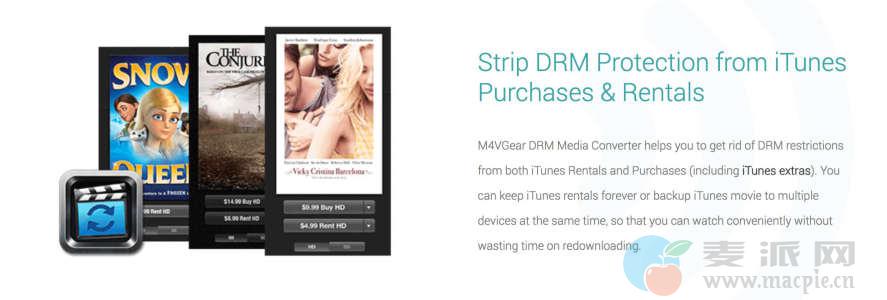 M4VGear DRM媒体转换器能够帮助你摆脱iTunes上购买和租借的电影的DRM保护限制。这样就等于你可以永久地备份你的iTunes媒体库中的所有电影,这些电影可以自由地在各种播放器和设备上播放。