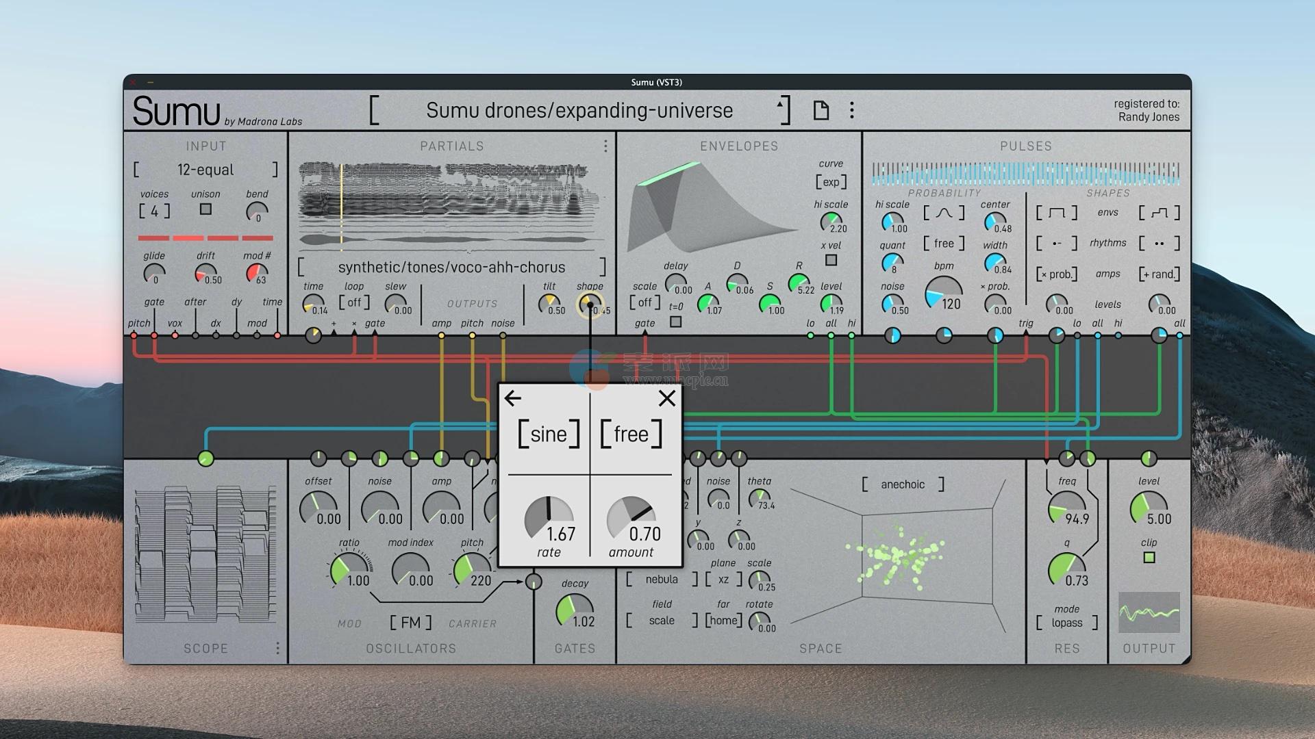 在Sumu中,采样声音被表示为多达64个带宽增强的分音的集合,每个分音的频率、音量和噪声都可以随时间而变化。这种声音的表现形式使得各种创造性的变化成为可能,从自然声音的时间延伸到异国情调的定音鼓操作。使用中央多声道patcher,声音中的每个部分都可以独立操作,感觉更像是在演奏,而不是在编程。挑几个谐波进行调频?没问题。根据频率延迟每个部分?当然可以。