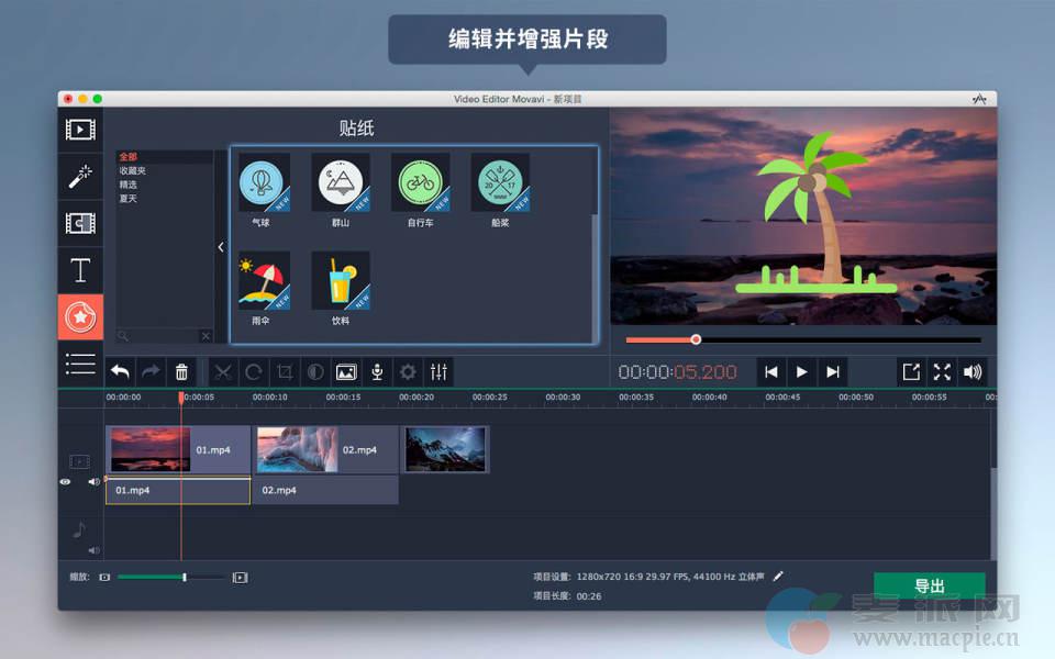 Movavi Video Editor是适用于Mac的最佳视频编辑软件,只需几分钟即可掌握。拥有快速高效的家庭电影编辑和照片幻灯片创作所需的一切。只需将您的视频和照片导入到该程序中,魔术般地提高视频质量,应用滤镜,添加标题,动画淡入淡出和音乐。简单的控制和直观的界面保证了短暂的学习曲线和大量的创意乐趣。
