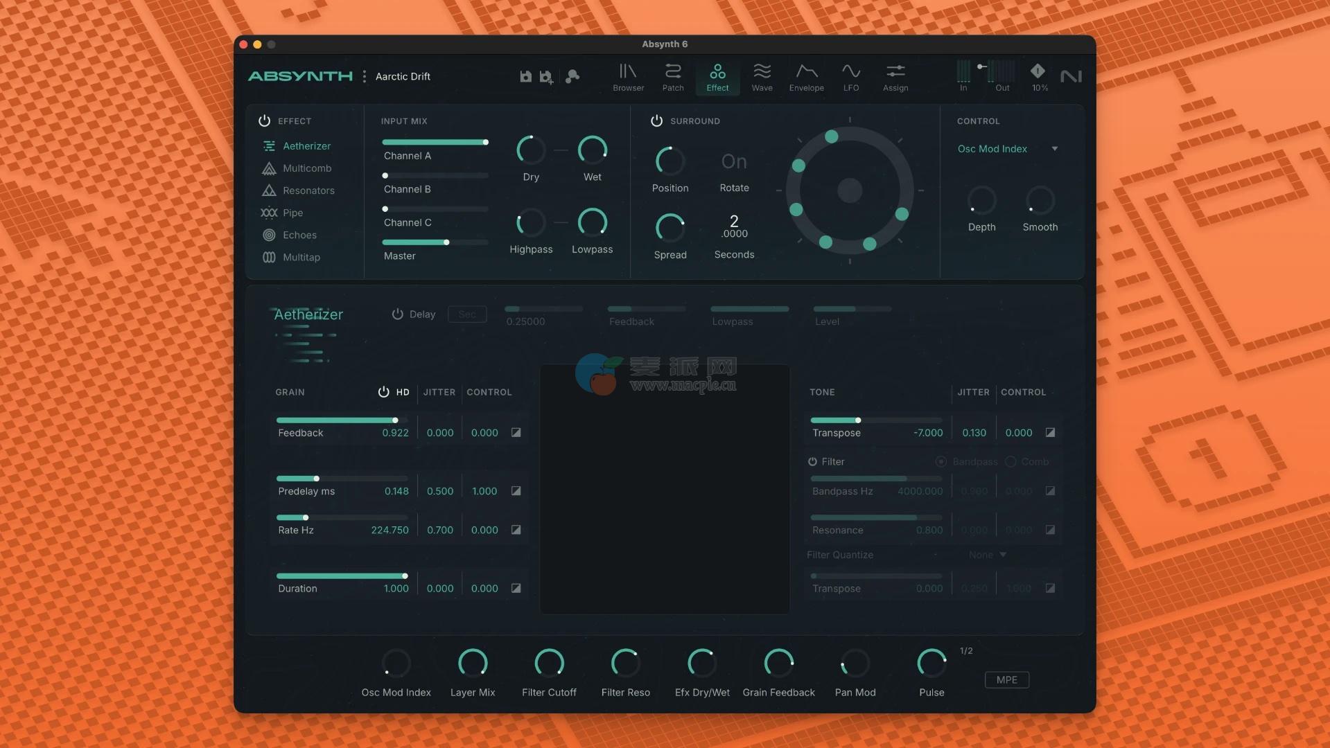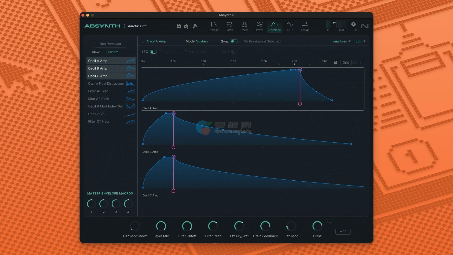 Absynth 6的68点包络系统提供循环、断点曲线、维持阶段和时间同步转换,以及专用调制LFO。这些灵活的形状让您可以制作出超越标准ADSR包络的不断演变的纹理和有节奏的运动。