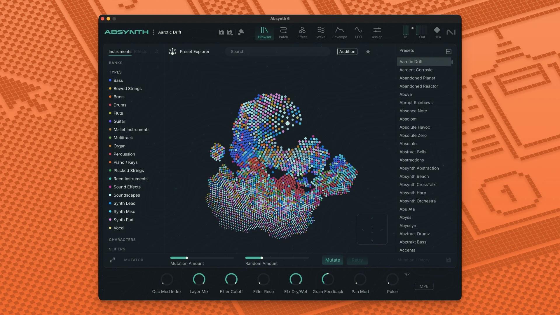 Absynth 6的核心是一个混合引擎,它将颗粒、FM、波表和减法合成与深度调制和一系列创造性效果相结合。它的三个振荡器通道为您提供了结构化的不可预测性和无尽的探索空间,非常适合进化、变化和惊喜的声音。