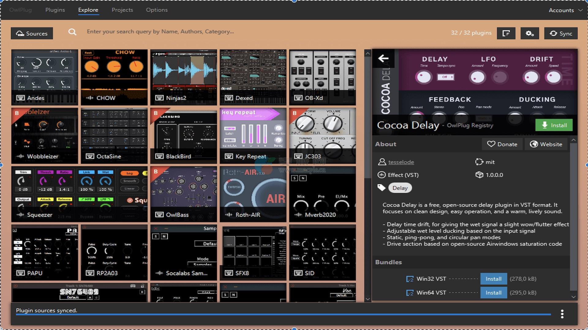 OwlPlug可以连接到几个远程资源来下载插件。远程源代码(或注册表)是一个可下载插件的集合,可以在本地安装。OwlPlug可以在“浏览”选项卡>源>添加新的源中配置为使用任何兼容的第三方源。