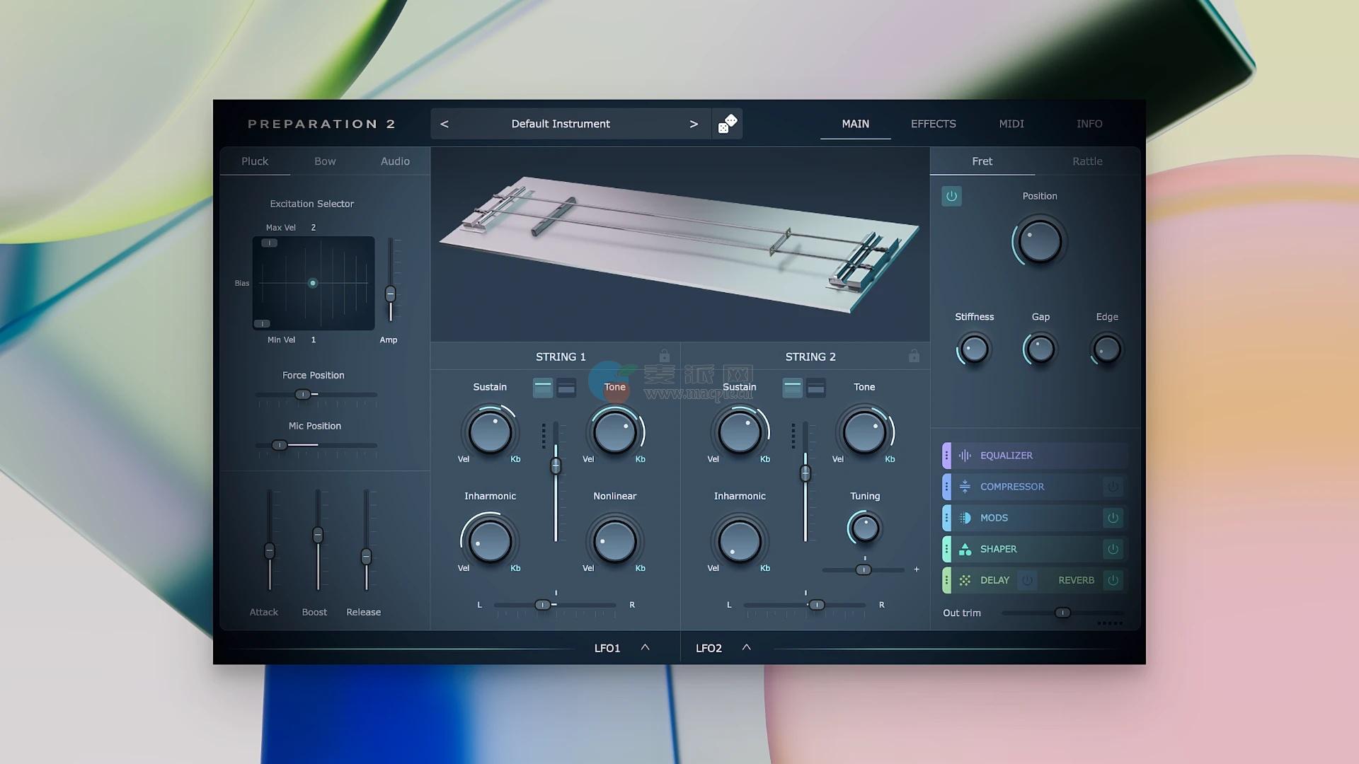 使用功能齐全的均衡器、压缩器、Mods、Shaper和延迟/混响效果塑造您的声音,这五个模块可以重新排序,然后在自己的选项卡中进行更深入的编程。Preparation 2的均衡器、失真、驱动、模糊、相位器、颤音和Wah效果来自Orastron的Brickworks。还有2个LFO、键盘和速度调制,用于定制模型的响应和FX参数。