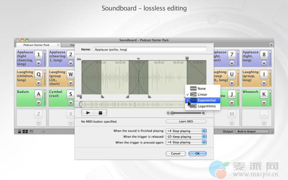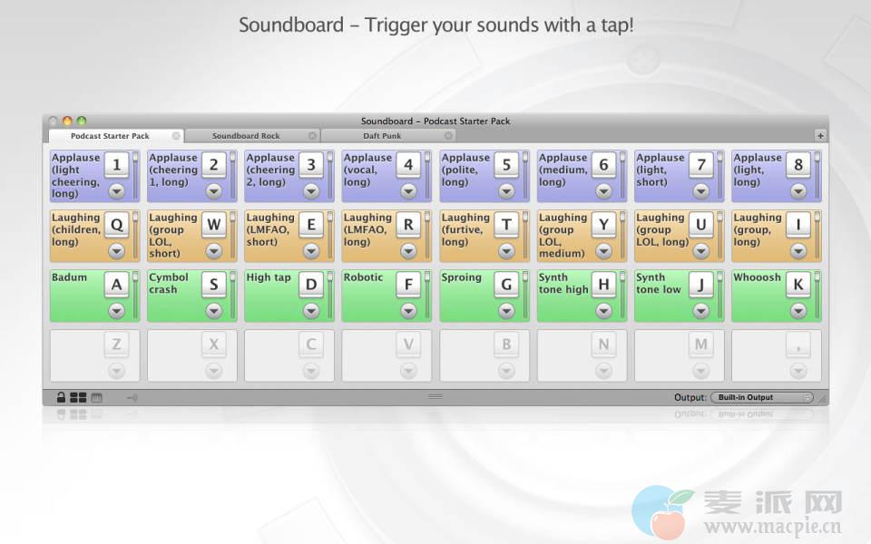 Soundboard for mac是Mac os平台上的一款帮助用户提升声音质量的Mac软件,Soundboard for mac提供了快速的方法,以提高生活事件、 播客或广播声音剪辑、 效果或音乐伴奏的效果。你所要做的,就是轻按一个键或单击鼠标按钮以启动声音播放立即到任何音频输出。