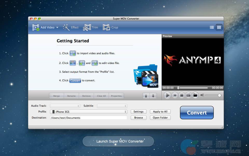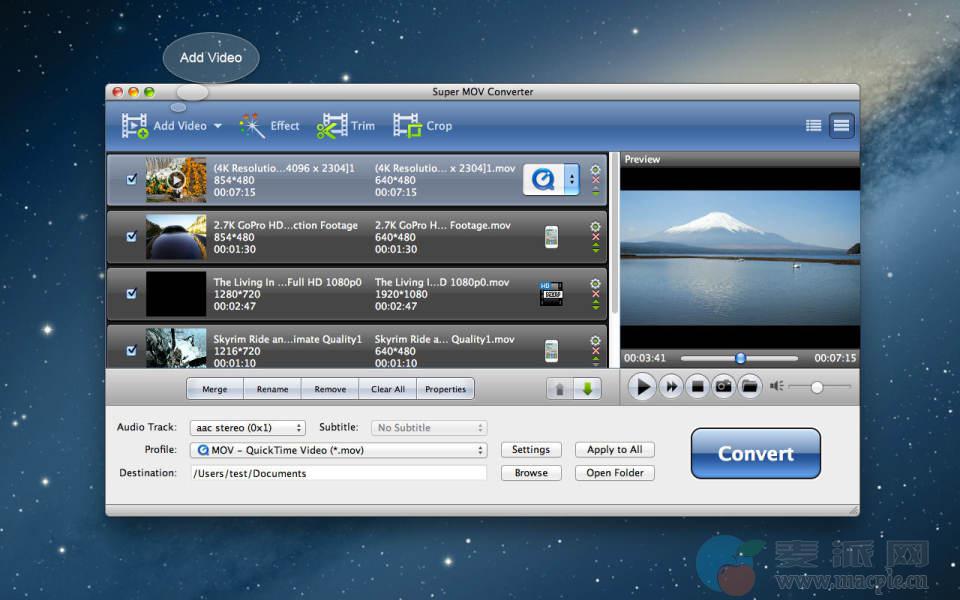 Super MOV Converter 是一款视频转换工具,他可以很快速的把其他视频转换为 MOV 格式。它可以帮助用户转换任何视频格式播放,让用户可以在苹果电视、iPhone 6等地方播放,非常的实用。与上级MOV转换,你可以导入视频文件到iMovie,Final Cut Pro更容易,在任何数字设备,无论何时何地你去看转换后的视频。