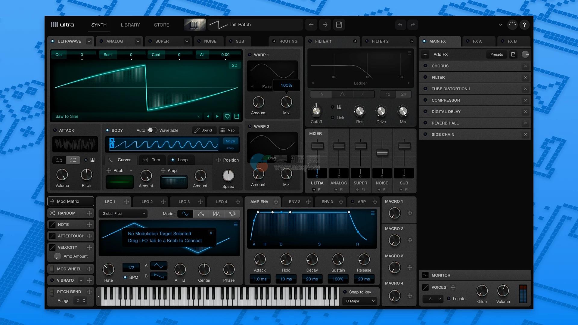 根据音符的高度和按压的力度分配不同的webiblas。UltraWaveTM引擎平滑地相互混合,并实时混合新的音色。