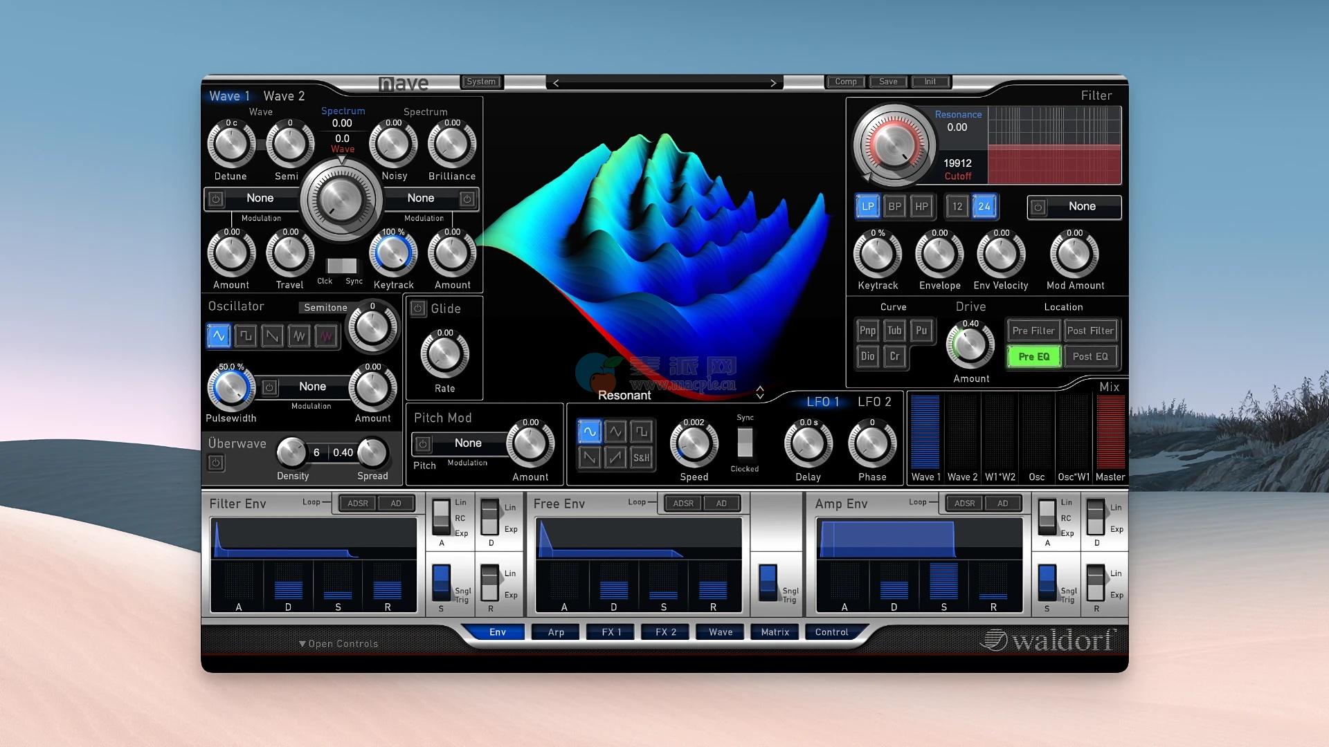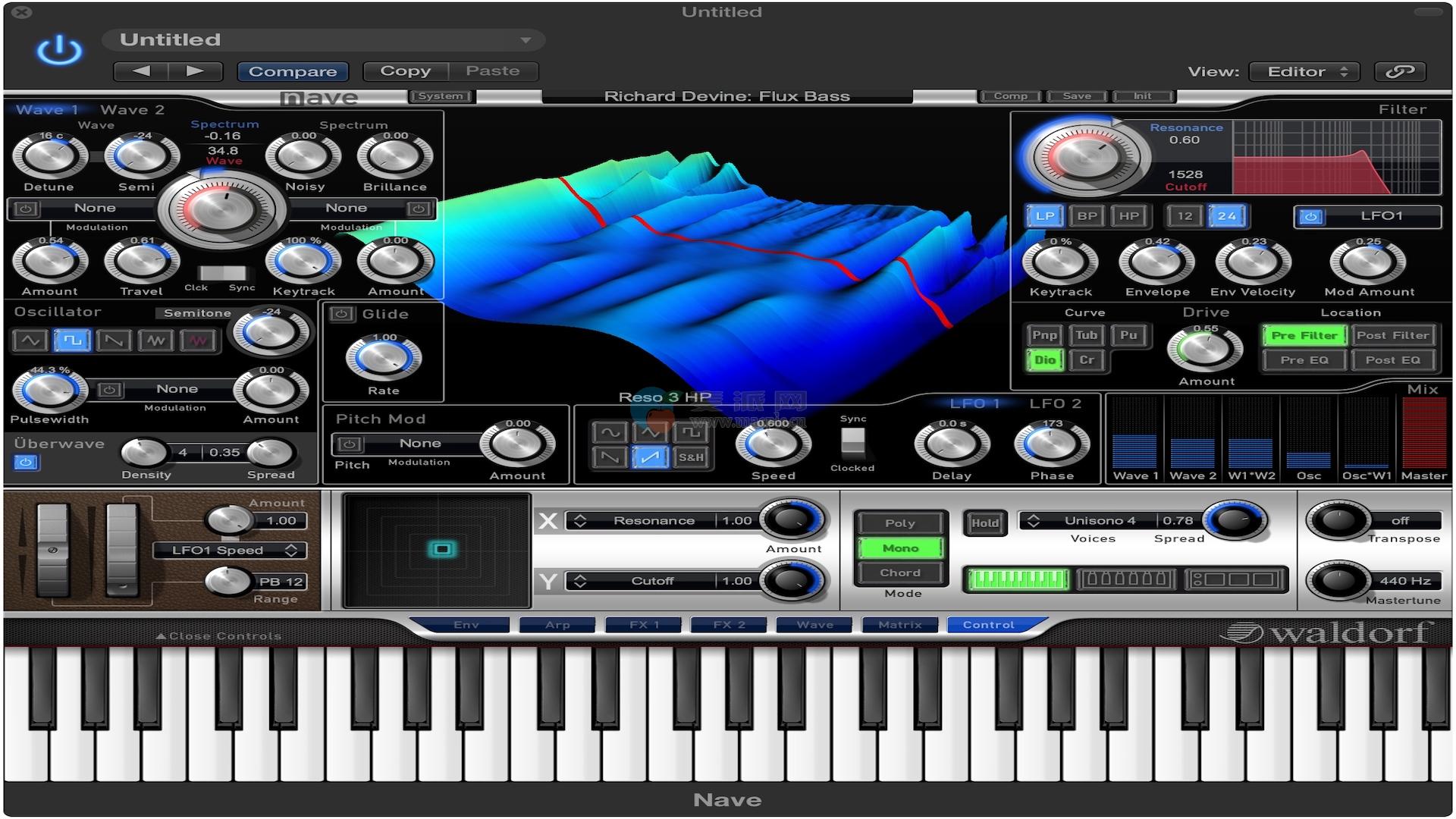 任何熟悉Waldorf软件乐器的人都会立即对典型的Waldorf工作流程有一种宾至如归的感觉,声音整形模块总是可以直接访问,所有自动琶音器、包络、效果和调制矩阵管理控制只需按一下虚拟按钮。