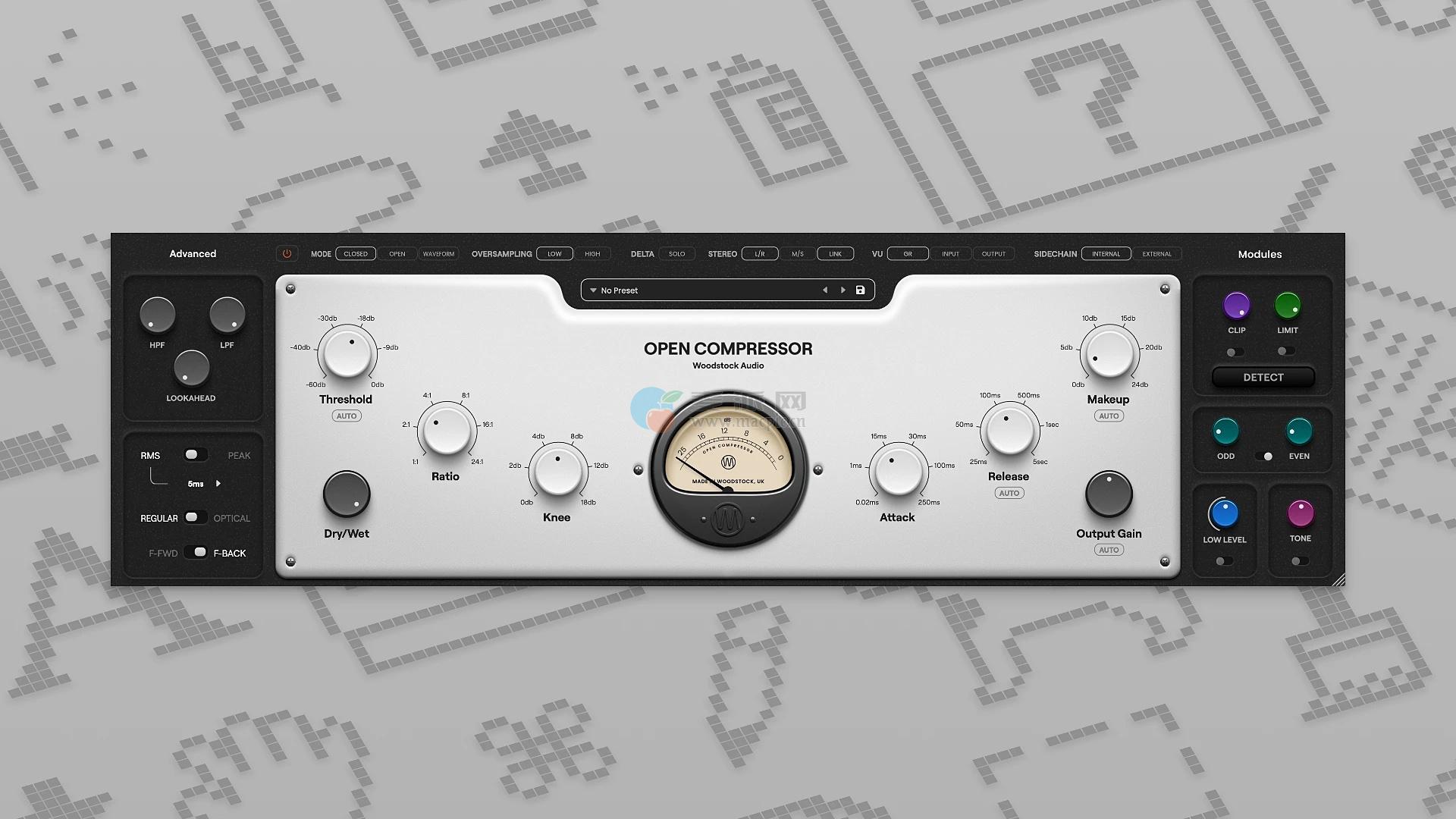 Open Compressor是一种通用压缩机,它将经典型号的关键功能结合在一个工具中。除了标准的动态处理,它还包含削波、限制、自动阈值设置和其他有用的模块。