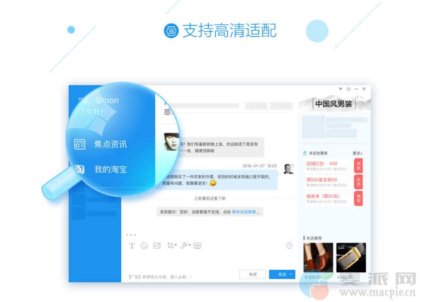 阿里旺旺MAC版专业的视觉效果及交互体验一定让苹果粉逛淘宝更爽。淘宝官方一直专注为Apple用户提供最炫体验最好的比价、逛街、购物等相关的电子商务应用。