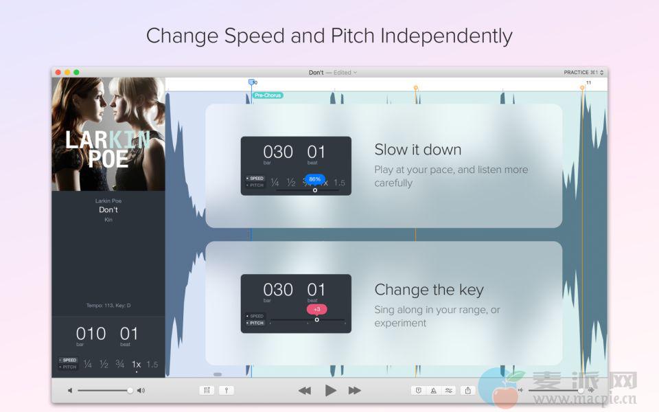 - 调整歌曲的音调以便在不同的音高下学习,或与你的乐器协调