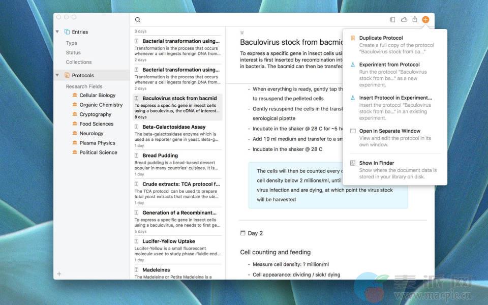 Findings破解版是知您网搜集到的Mac os系统上一款专为科学家开发的笔记本电脑软件。在实验室进行实验时,记录每一个实验步骤非常重要,其有利于重复实验,以及发布实验结论。包括成果存储、数据分析、搜索、复用、分享、维护等等。