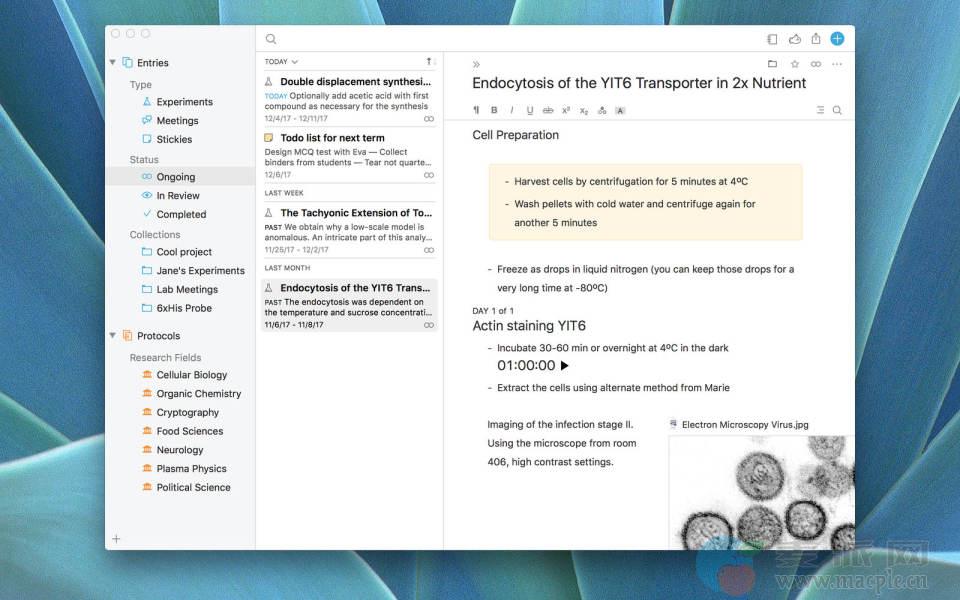 在实验室进行实验时,记录每一个实验步骤非常重要,其有利于重复实验,以及发布实验结论。实验记录的积极性毋庸置疑,从科学实验存在以来,记录都是通过纸张。纸张有很多优势,比如自由及灵活性。但是如今,由于纸张本身的不足,在很多领域已被计算机所取代:成果存储、数据分析、搜索、复用、分享、维护等等。