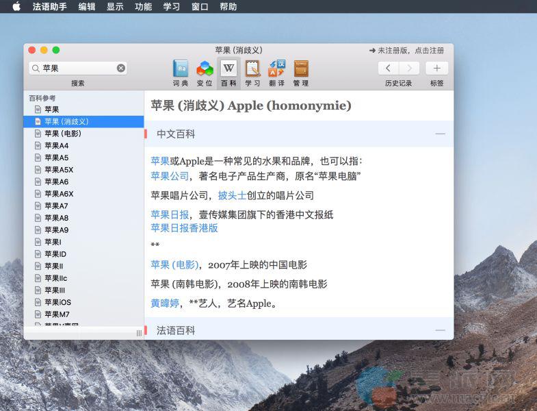 Mac版《法语助手》在功能上没有任何简缩,这是专为Mac OS X系统开发的法语学习软件。完整的法汉词典,收入词条185000余个;汉法词典收入词条245000余个。 词库总量达80MB。