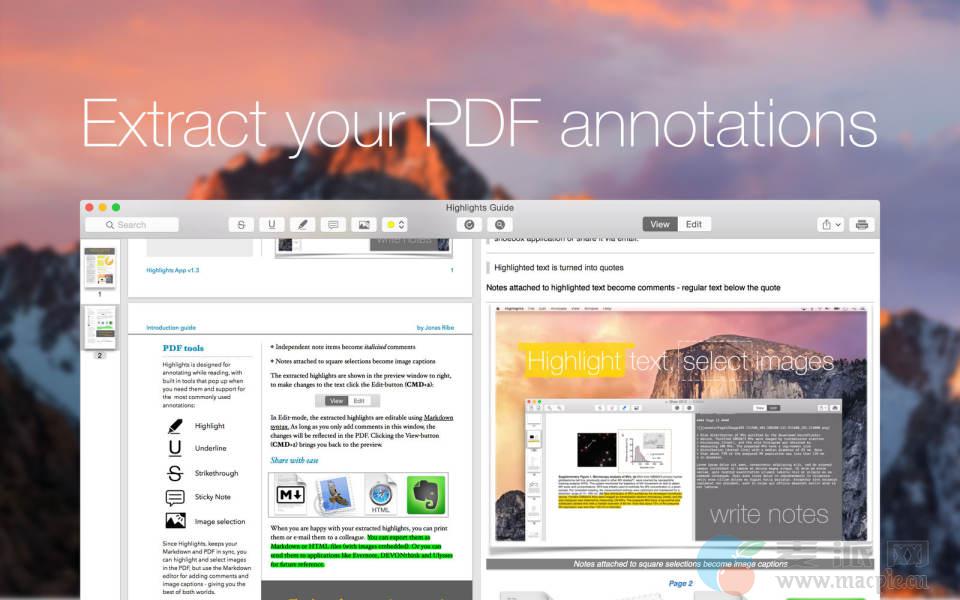 Highlights是一款PDF阅读器,可从PDF中提取突出显示的文本,备注和图像选择,并允许您通过电子邮件共享它们,将它们归档至shoebox应用程序,例如Evernote,DEVONthink和VoodooPad,或者将它们保存为便携式格式,例如Markdown和HTML。