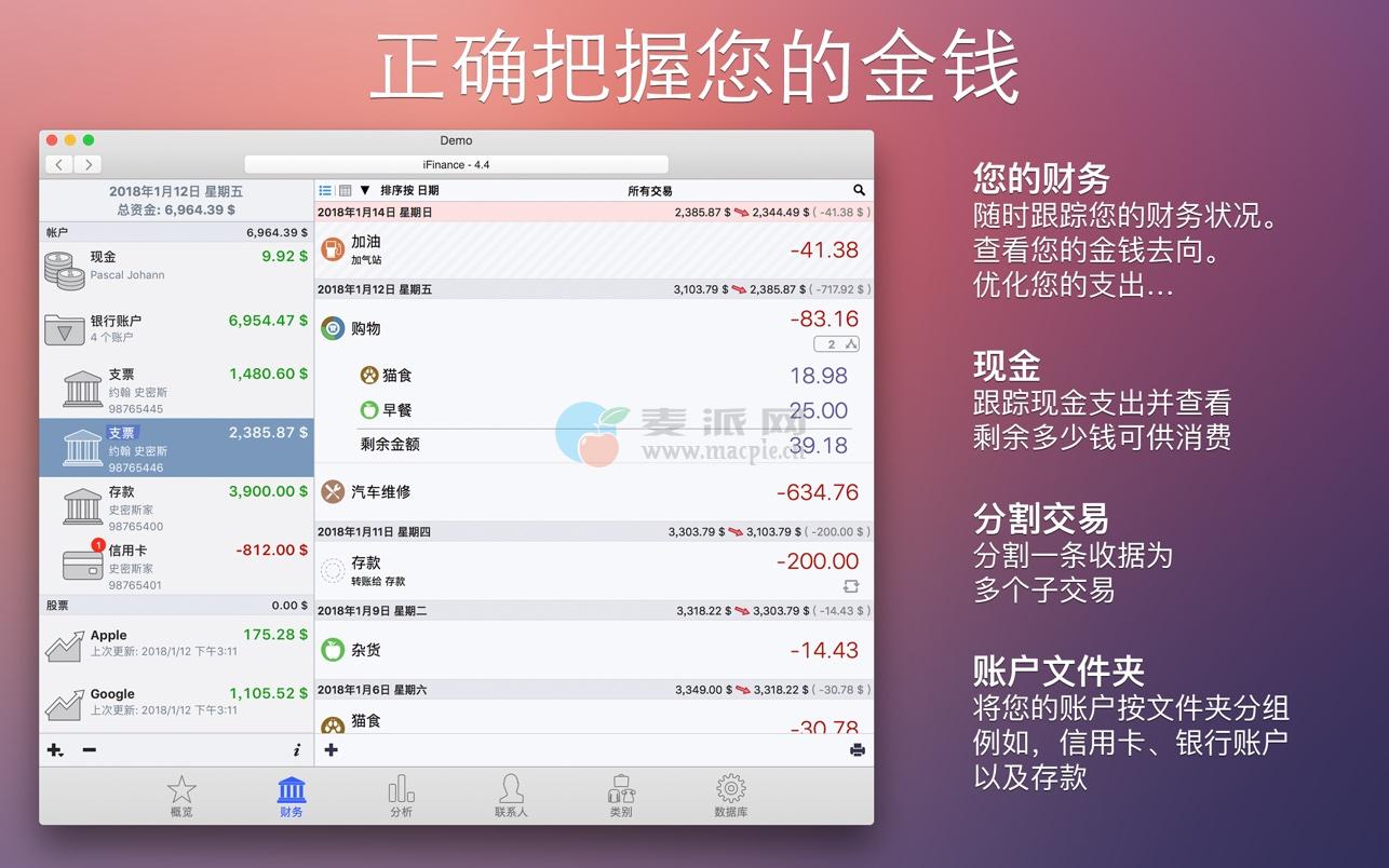 iFinance 4可以让你以最方便快捷的方式跟踪收入和支出。快速浏览一下图表,你就能估算出你花了多少钱,收入来自哪里。优化你的财务状况——这很有趣!自动分类、关键词、预算和数据分析将把你的银行账户变成一个不仅仅是数字列表的东西!