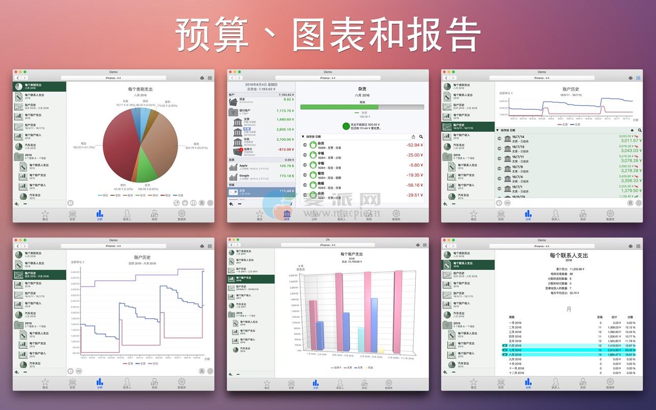 iFinance 4 提供了大量易于定制的图表和报告。根据您制定的规格,iFinance 会分析您的钱从哪来,又花在了哪些地方。使用预算功能找出您本月的余额或者您是否成功留下了足够的钱供月底消费。预算还可以为指定类别创建,例如服装、杂货或晚上看电影的每月预算。