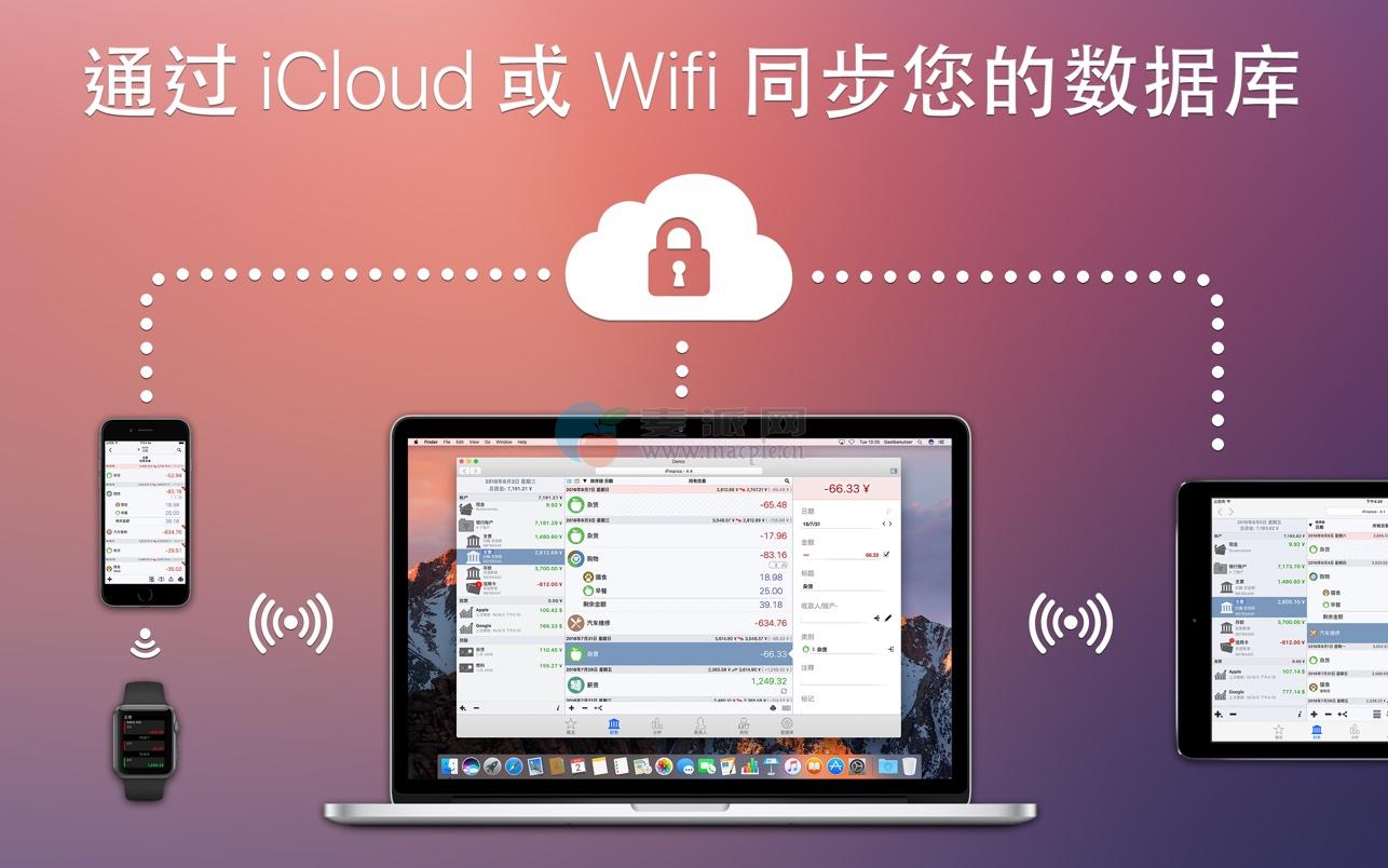 在 Mac 电脑、iPhone 和 iPad 之间,通过 iCloud 或集成的 WiFi 同步您的数据。集成的 WiFi 同步功能也允许您以多用户一起使用和编辑数据库。如果您负责俱乐部或组织的金融事务,或者您要与他人管理银行账户,这都是非常有用的。