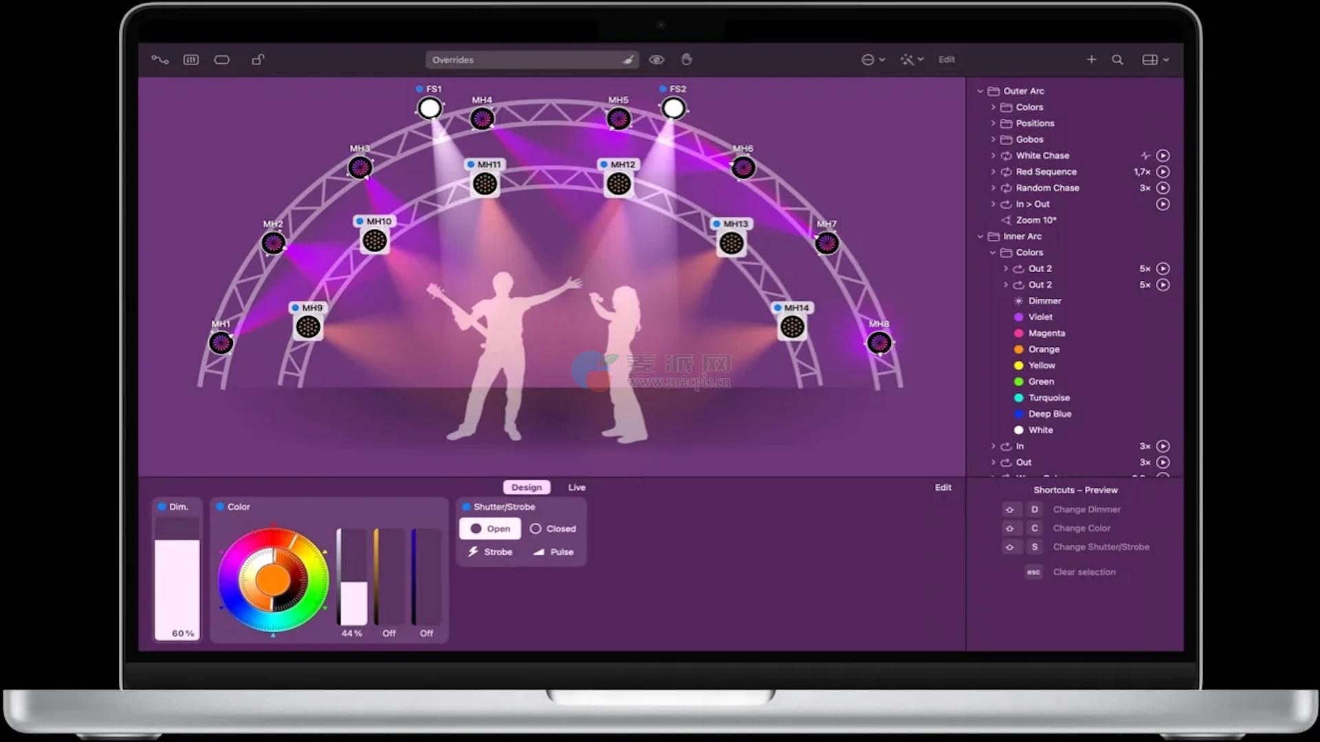 通过一个优雅、易用的界面控制移动头、扫描仪、LED矩阵、激光器或任何支持DMX协议的设备。构建一个预置、序列和提示库,以创建令人惊叹的灯光表演。通过不同制造商的USB和以太网接口输出多达四个DMX宇宙,包括DMXking、ENTTEC、Eurolite、耶塞、Robe、Stage-Profi或Velleman。