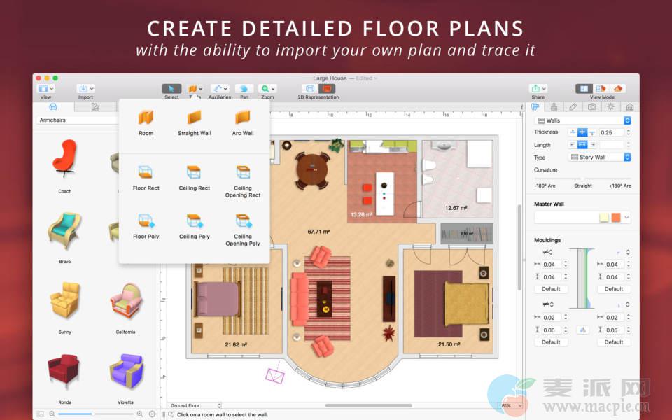 Live Home 3D可帮助您绘制详细的2D平面图并自动构建3D结构。您可以跟踪导入的平面图或使用程序智能工具从头开始。
