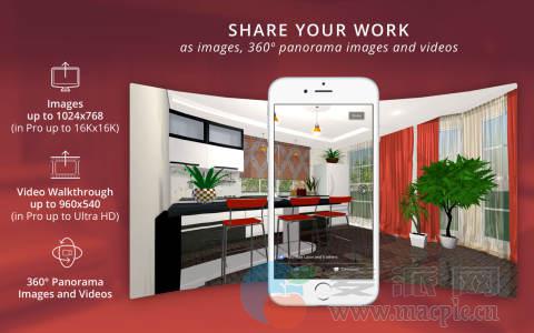改变你的家居设计项目,并与客户,同事,朋友和家人分享结果。设置自定义摄像机角度并将视图导出为JPEG,TIFF,PNG和BMP。呈现3D视频演练,并在YouTube或Vimeo上分享。创建360°全景JPEG图像或360°视频。