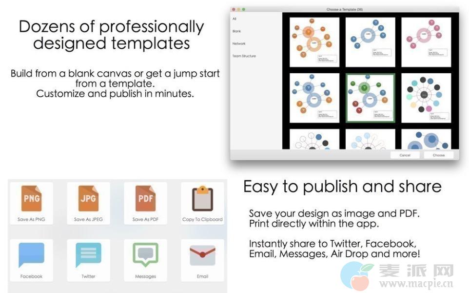 - 通过导出为多种文档格式来协作和共享,可导出为:PDF,JPG和PNG。