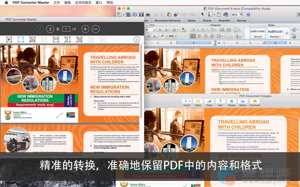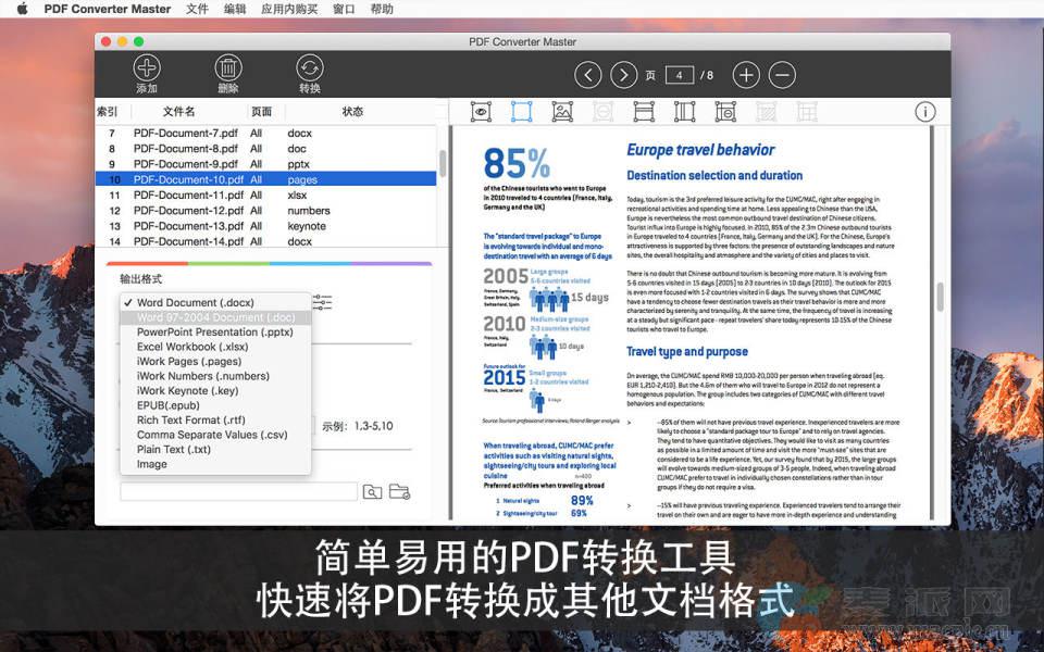 PDF Converter Master,帮助您快速地将PDF文档转换成16种常用的文档格式,包括Microsoft Office,iWork格式,EPUB, rtf, csv, txt以及各种图片格式。有了它的帮助,您不再需要为文档转换而烦恼。不管转换什么样的文档,PDF Converter Master都会尽最大限度地保留原本的格式,内容,图片等等。