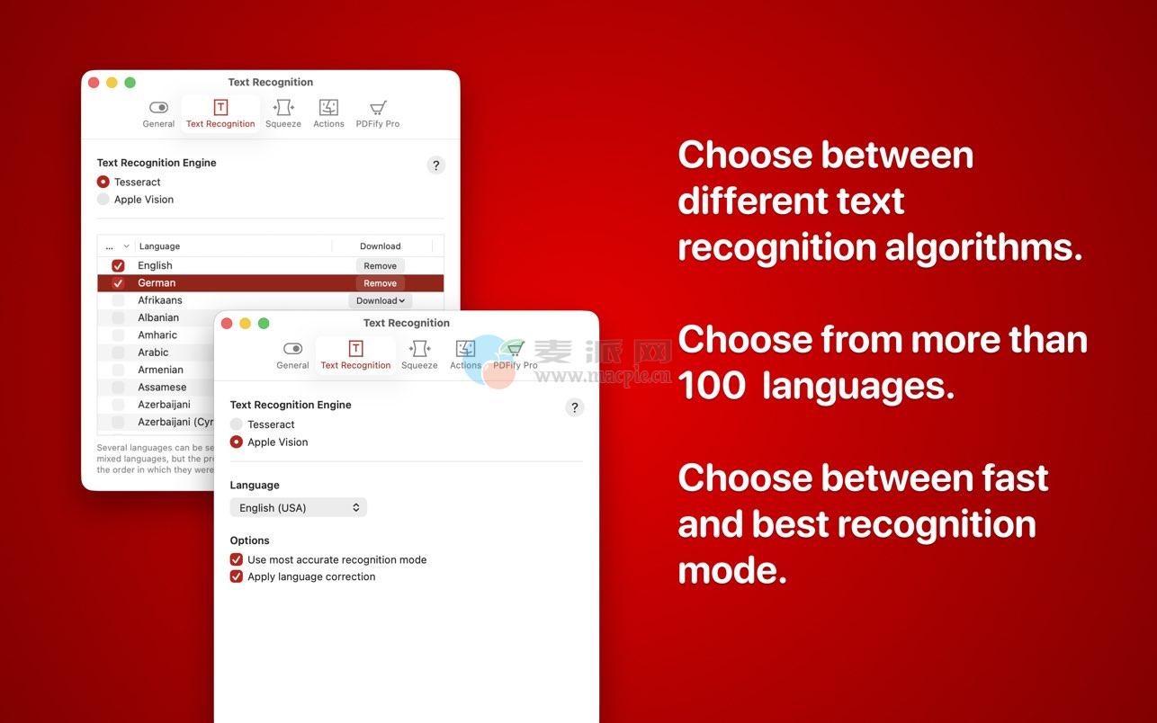 – OCR功能:在集成的Apple视觉识别或成熟的Tesseract替代产品之间进行选择。