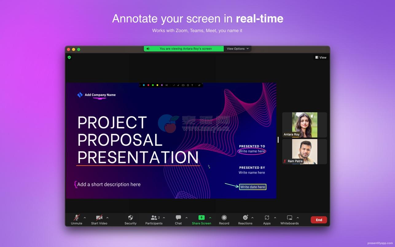 Presentify——一款帮助您提高演示文稿、在线课程和视频教程质量的应用程序,允许您向任何屏幕添加注释、高亮显示光标等。您可以为屏幕上的任何内容添加注释,无论是图像、视频、PDF文件、代码还是任何内容。Presentify对于在线学习、视频教程、演示、远程工作等非常有用。