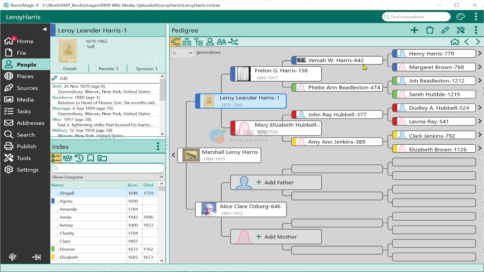 RootsMagic是一个家谱创作软件,具有丰富的工具箱。它有六个主视图,外加一个便于导航的侧边栏。只需单击所需视图的选项卡,即可在视图之间切换。使用鼠标或箭头键,所有视图都是完全可导航的。双击一个人的名字会显示该人的数据输入屏幕。你甚至可以并排打开多个数据库。