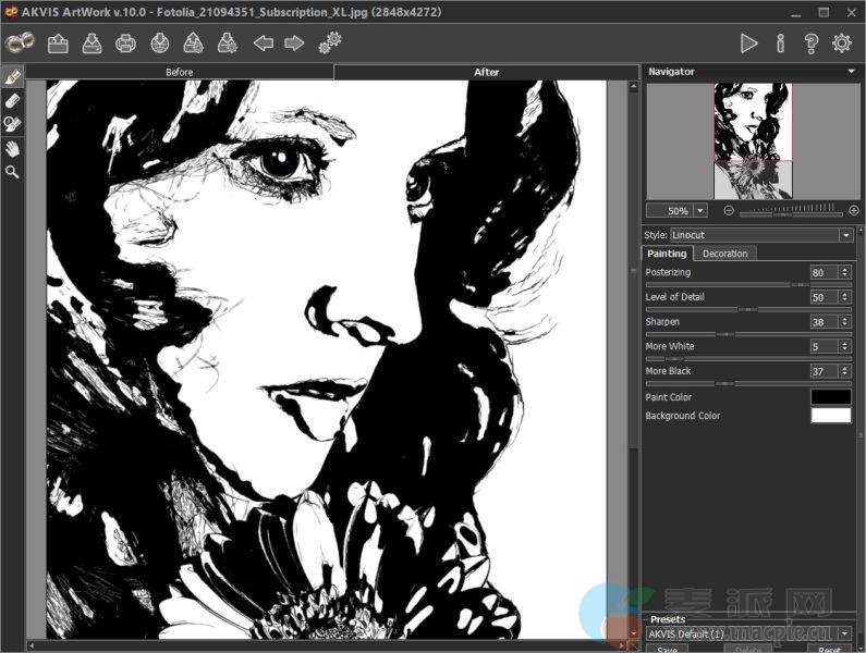 ArtWork的效果提供了后期处理工具,用于手动修整已处理的图像。您可以通过消除油漆不规则性来优化图像,为您的杰作添加一些最后的润色。