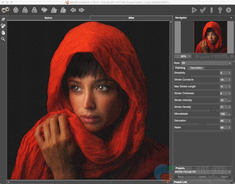 将你的照片转换成油画。AKVIS ArtWork使用原始照片作为参考,自然地绘制笔触。即使使用默认设置,您也可以非常接近手绘作品,达到逼真的效果。调整选项,你可以研究各种油画风格。对于那些需要更大灵活性并且对最终气喘应该如何看待的人有想法的人来说,有一种叫做“ 冲程方向”的工具。这款半自动且高度智能的工具是真正的天赐之物,因为它可以让您完全控制笔画!