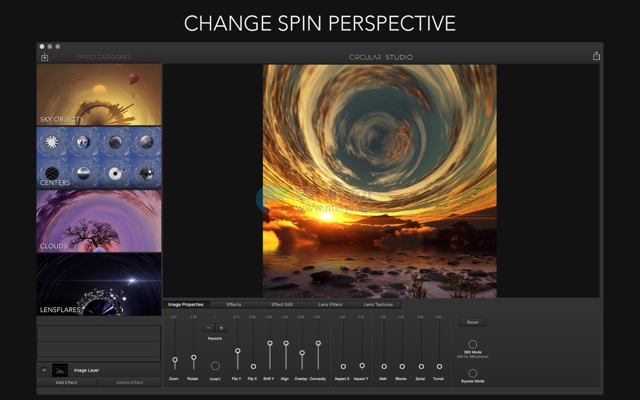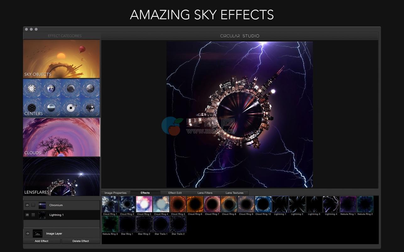 • Mac上非常强大的“小星球”应用程序。它具有创新的新功能,例如天空物体,中心,云层和耀斑等。Circular Studio是一个有趣的应用程序,具有这类应用程序中从未见过的强大新功能。你可以很容易地放大和缩小你的圆形图像,使它恰到好处。一旦你对你的图像满意,添加专业的效果,如镜头光晕和天空物体,如太阳、月亮、鸟等。