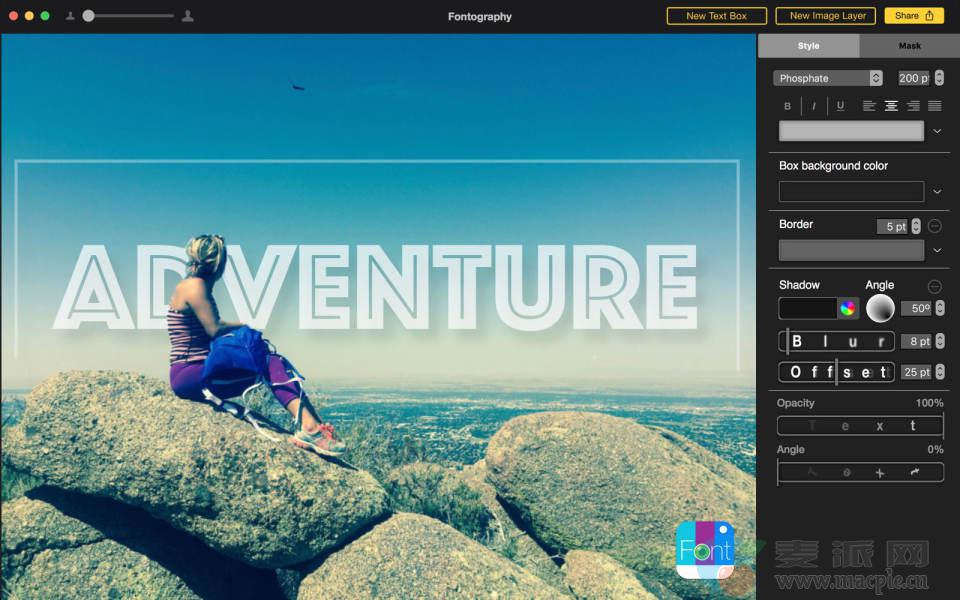 Fontography文本梯度和先进的渐变选项使您能够使字体+完美的照片呈现。所需的工具可以以各种方式共享:邮件,消息,Facebook,推特,处理的图片可以保存为JPG,保存为文档fontography以便以后可以对其进行编辑。