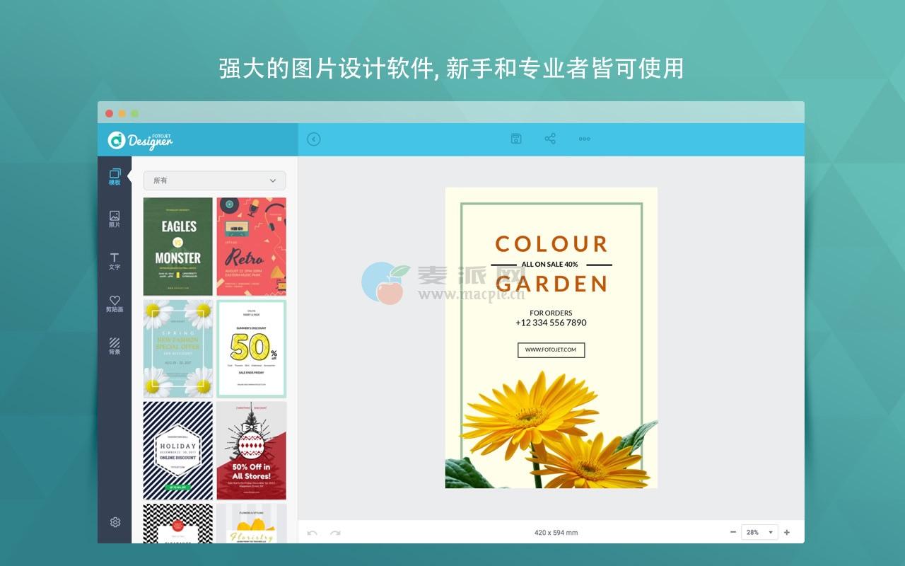 Mac上一款强大且易用的图片设计软件,FotoJet Designer让图片设计变得前从未有的简单. 通过它提供的900+模板, 上千款资源以及强大的编辑工具, 即时你没有任何专业设计技巧,你也可以像个设计师一样快速地设计出独一无二的社交图片, 卡片, 邀请函, 海报, 传单以及横幅等.