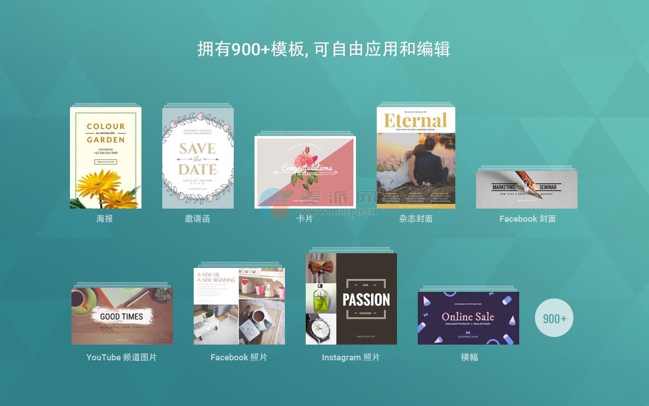 • 提供大量精美设计的卡片, 邀请函, 海报, 传单, 商标, Facebook 广告, 通栏广告和杂志封面模板.