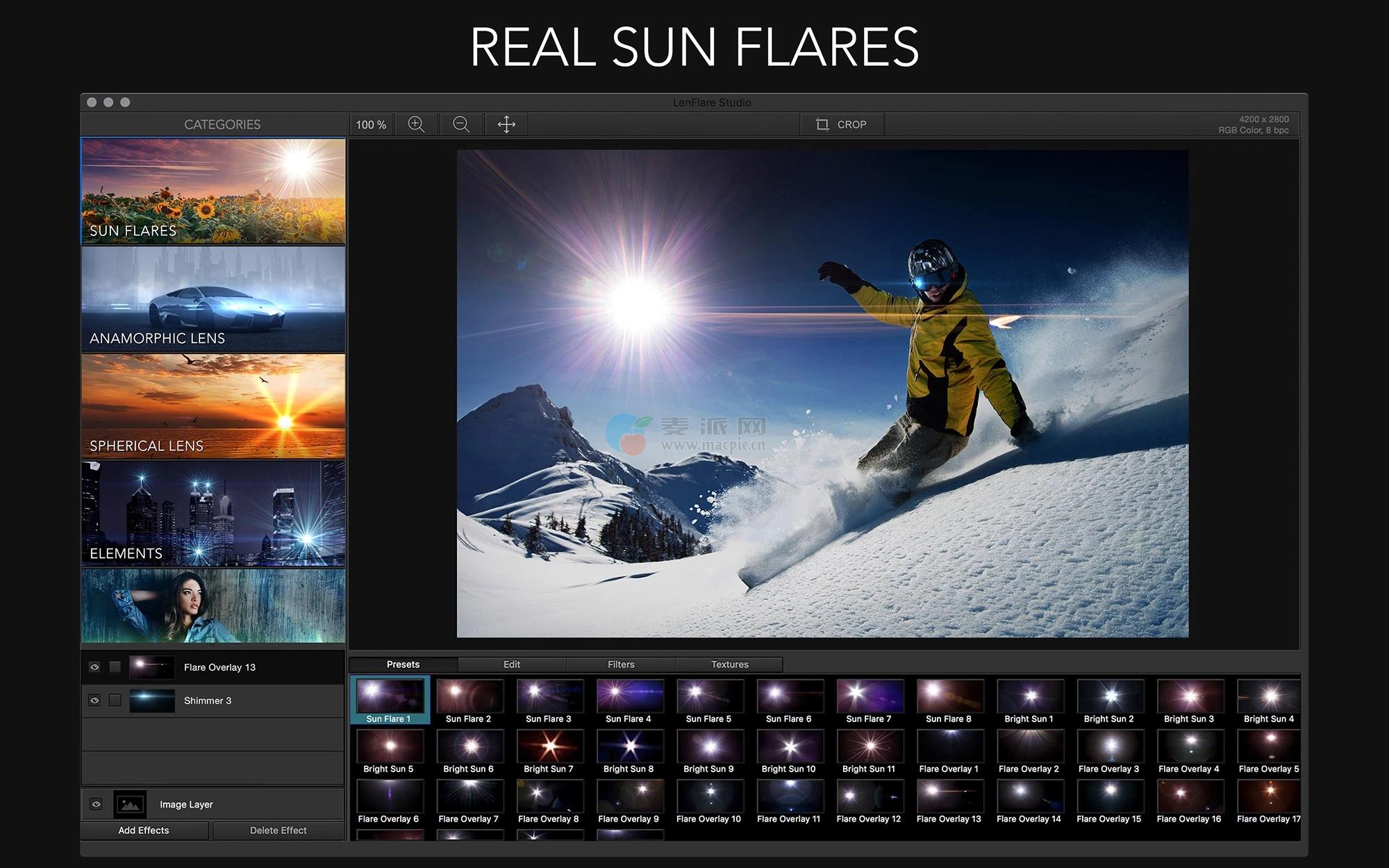 LensFlare Studio拥有超过100种高分辨率光学效果。当您放置光源时,每种效果都会动态响应,逼真地模拟各种镜头类型、反射和边缘眩光。