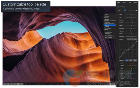 利用丰富的精确工具调色板对光线和色彩进行最大限度的控制:从曝光,阴影和高光到曲线,分割色调等等。
