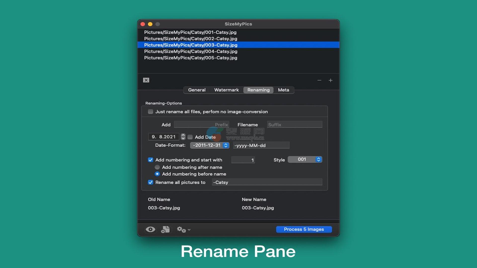 SizeMyPics还提供了一个选项,只需重命名所选文件,而无需进行任何转换或调整大小。