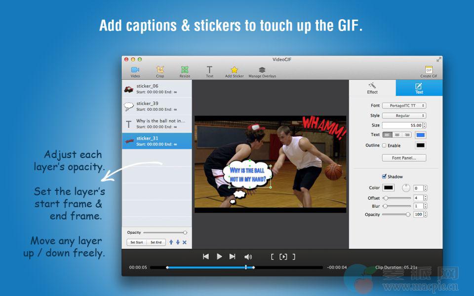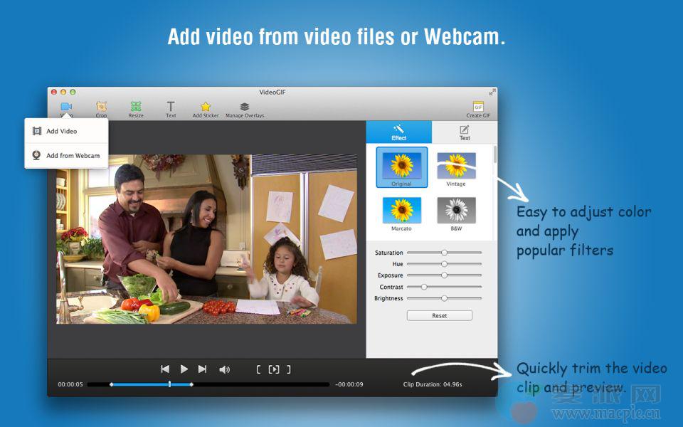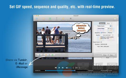 VideoGIF可精确控制输出的时间长度,并可添加黑色和白色、灰度、浮雕、反转、蓝色、锐化、噪音、亮等特效,调整图像大小,轻松提取视频文件所有帧为单独的图像文件,并可导出为JPG,GIF,BMP,PNG等流行的图片文件格式。