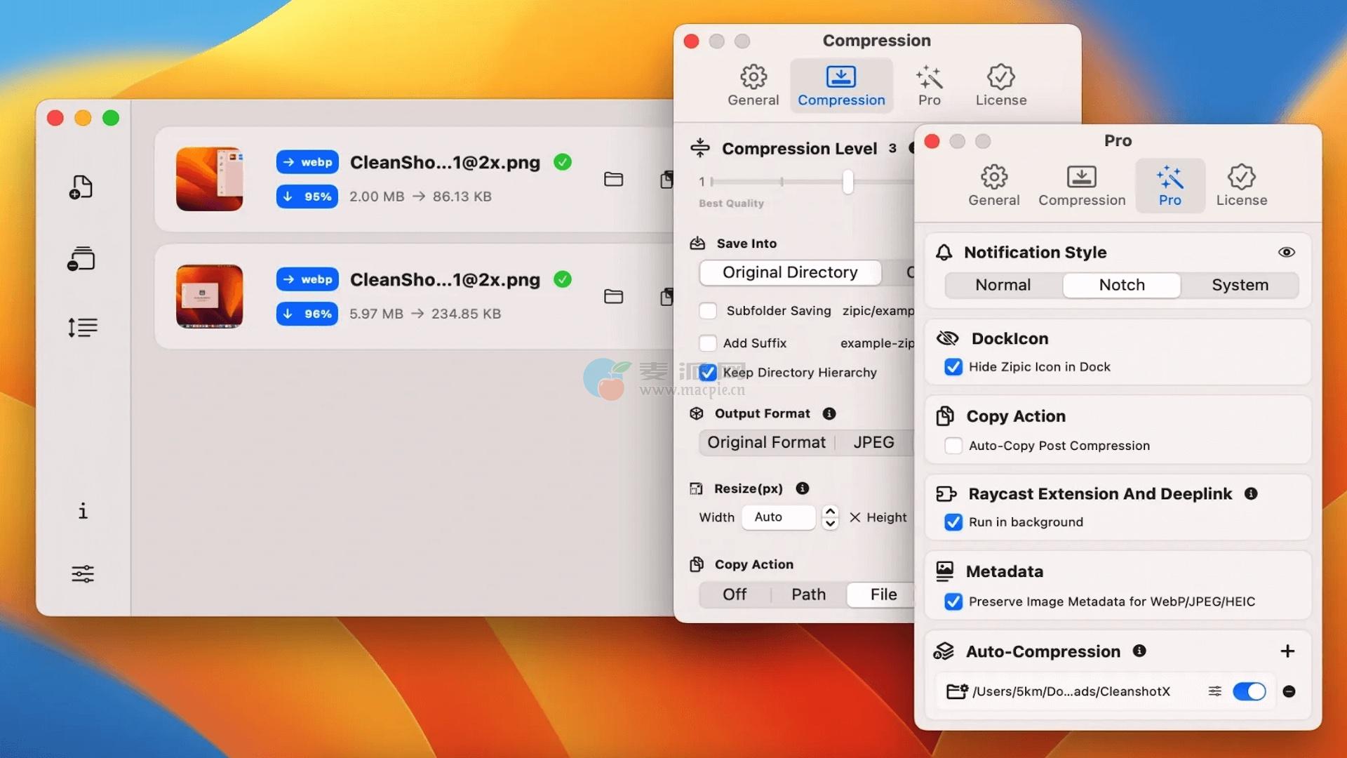 用于自动化的专业功能:高级功能包括剪贴板自动压缩、用于在特定目录中自动压缩的文件夹监视,以及Raycast Extension和Apple Shortcuts等集成选项。