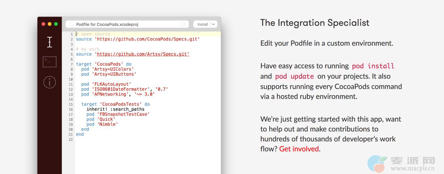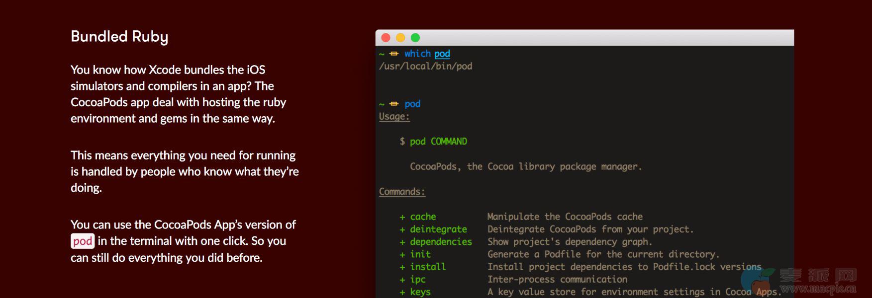 Cocoapods Mac版是Mac平台上的一款开发应用,是iOS最常用最有名的类库管理工具。当你开发iOS应用时,会经常使用到很多第三方开源类库,比如JSONKit,AFNetWorking等等。可能某个类库又用到其他类库,所以要使用它,必须得另外下载其他类库,而其他类库又用到其他类库,“子子孙孙无穷尽也”,这也许是比较特殊的情况。总之,手动一个个去下载所需类库十分麻烦。另外一种常见情况是,你项目中用到的类库有更新,你必须得重新下载新版本,重新加入到项目中,十分麻烦。